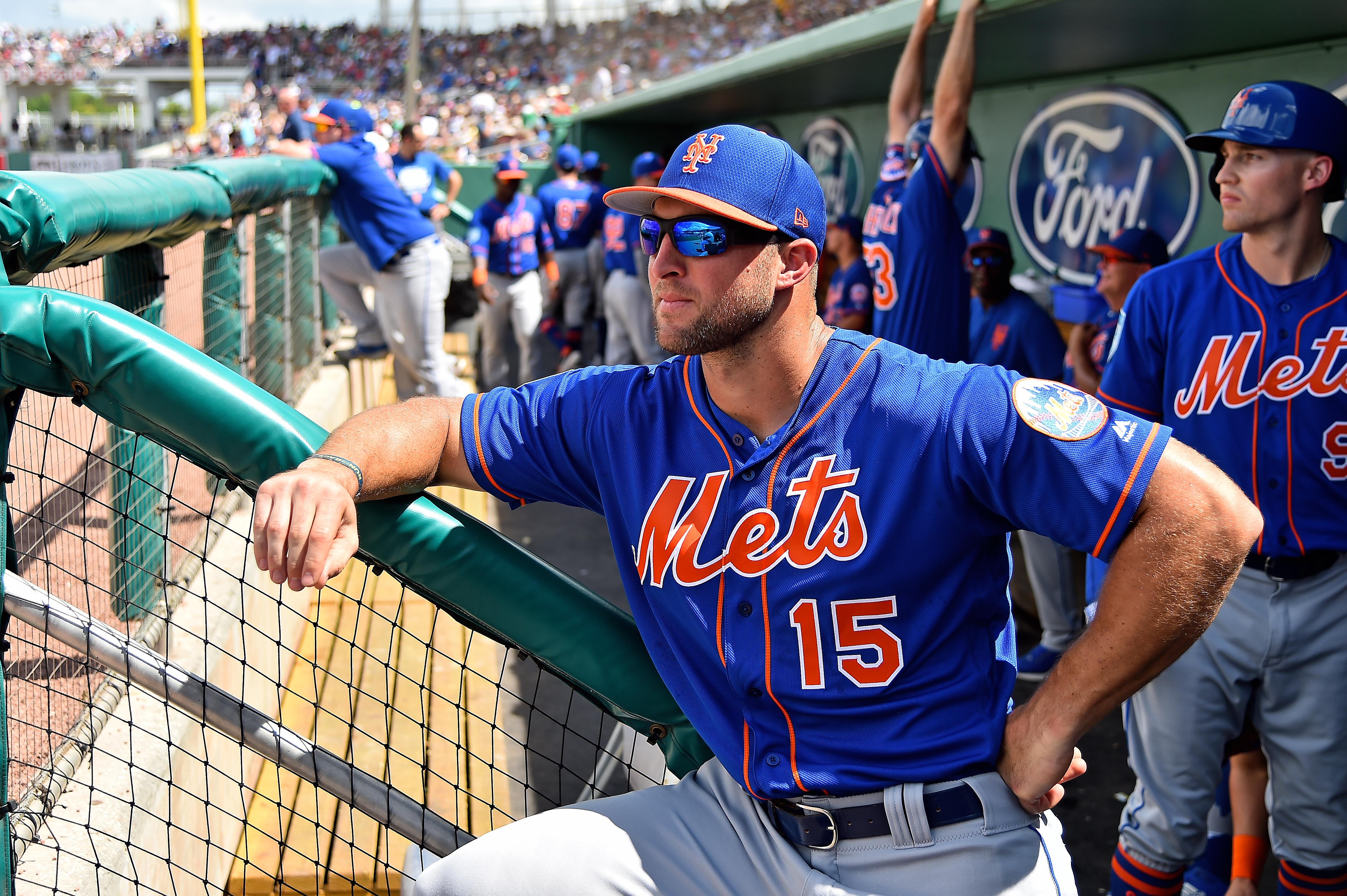 Mar 9, 2019; Fort Myers, FL, USA; New York Mets left fielder Tim Tebow (15) looks on from the dugout priror to the spring training game against the Boston Red Sox at JetBlue Park. Mandatory Credit: Jasen Vinlove-USA TODAY Sports / Jasen Vinlove