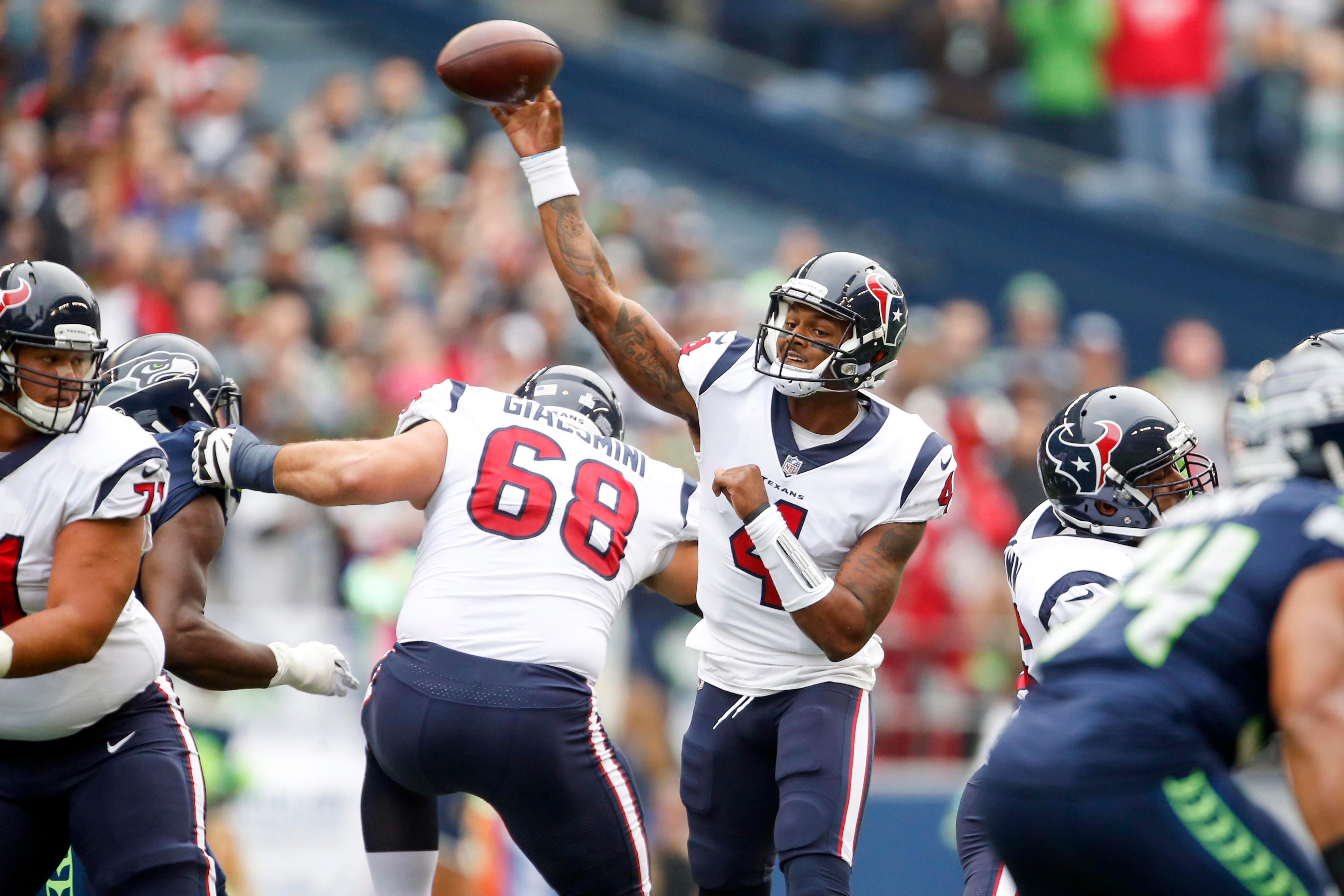 Oct 29, 2017; Seattle, WA, USA; Houston Texans quarterback Deshaun Watson (4) passes against the Seattle Seahawks during the first quarter at CenturyLink Field. Mandatory Credit: Joe Nicholson-USA TODAY Sports / Joe Nicholson