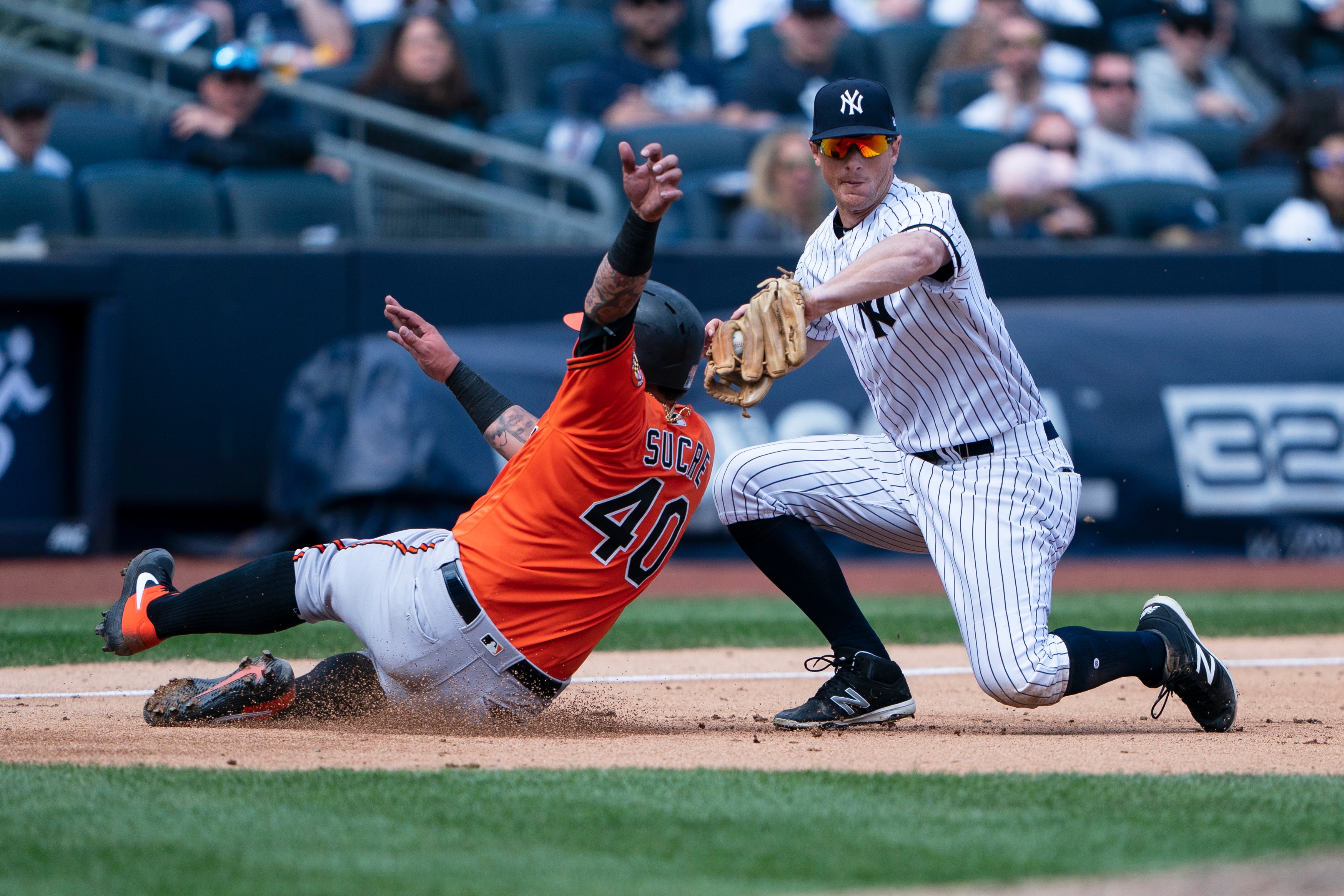 Mar 30, 2019; Bronx, NY, USA; Baltimore Orioles catcher Jesus Sucre (40) avoids a tag by New York Yankees third baseman DJ LeMahieu (26) to advance to third base on a fly ball during the sixth inning at Yankee Stadium. Mandatory Credit: Gregory J. Fisher-USA TODAY Sports / Gregory Fisher