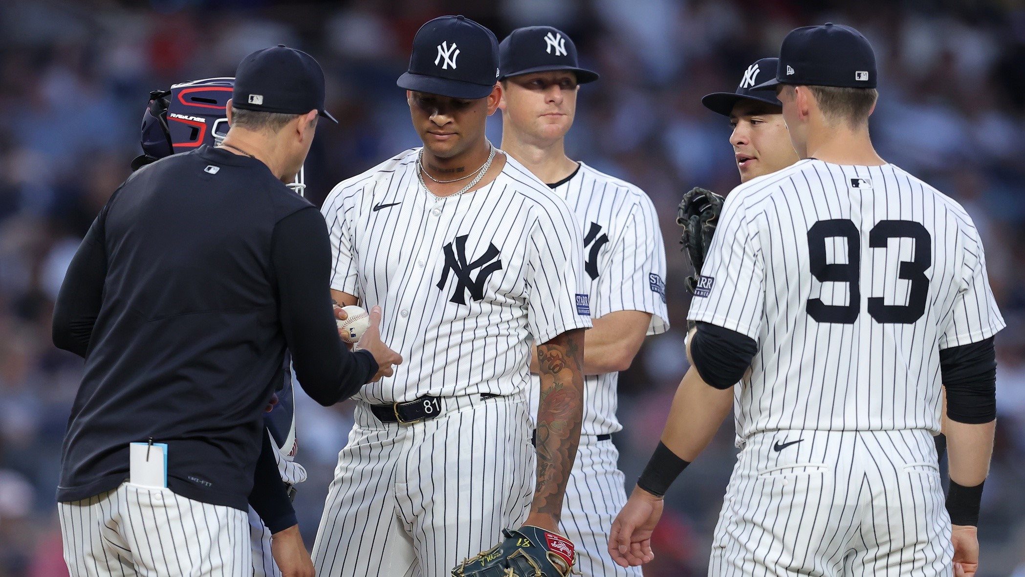 Jul 2, 2024; Bronx, New York, USA; New York Yankees starting pitcher Luis Gil (81) hands the ball to manager Aaron Boone (17) after being taken out of the game against the Cincinnati Reds during the fifth inning at Yankee Stadium. / Brad Penner-USA TODAY Sports