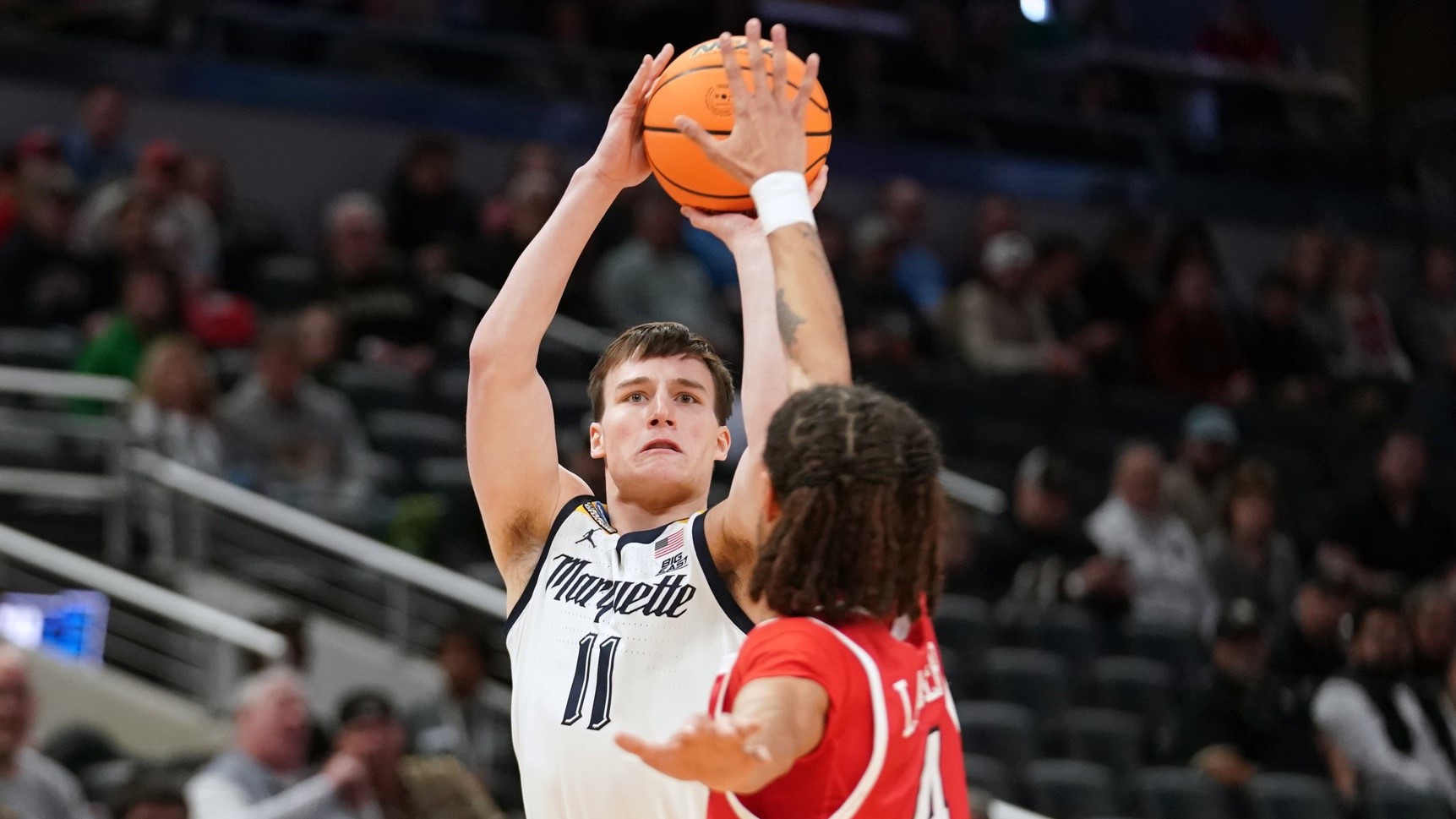 Mar 22, 2024; Indianapolis, IN, USA; Marquette Golden Eagles guard Tyler Kolek (11) shoots against Western Kentucky Hilltoppers guard Khristian Lander (4) in the first half in the first round of the 2024 NCAA Tournament at Gainbridge FieldHouse / Robert Goddin-USA TODAY Sports