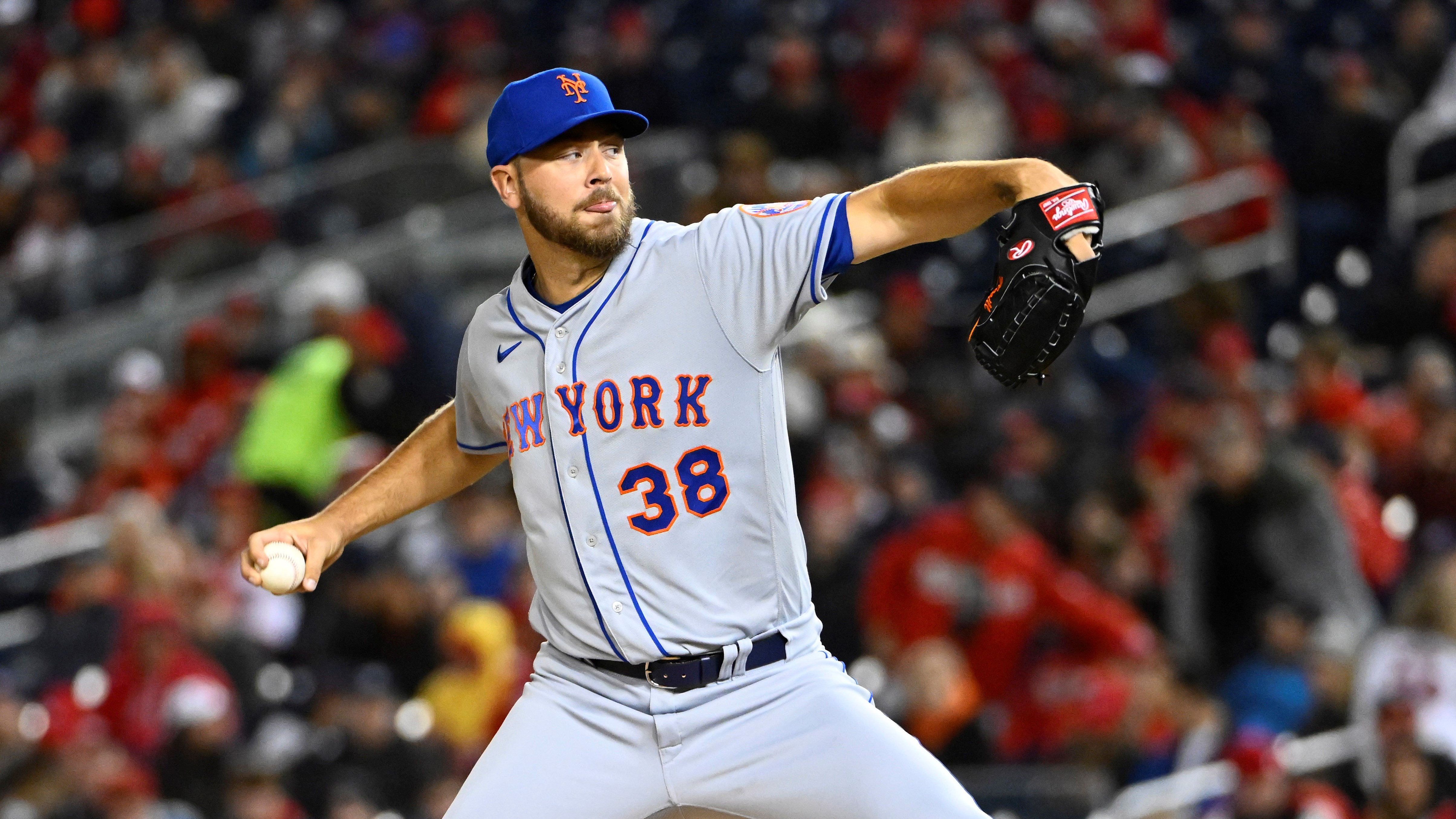 Apr 7, 2022; Washington, District of Columbia, USA; New York Mets pitcher Tylor Megill (38) throws a pitch against the Washington Nationals during the first inning at Nationals Park. Mandatory Credit: Brad Mills-USA TODAY Sports / Brad Mills-USA TODAY Sports
