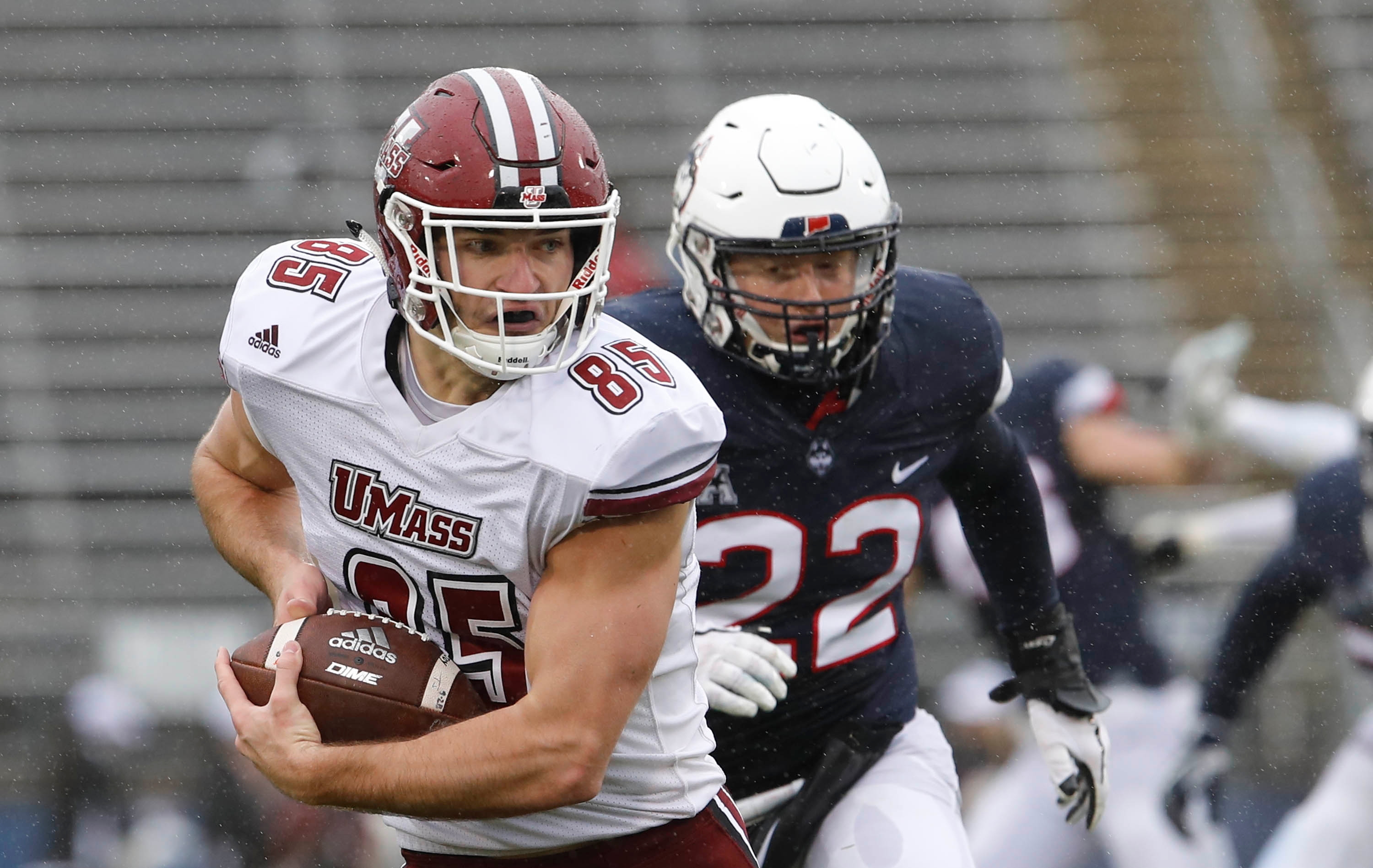 Oct 27, 2018; East Hartford, CT, USA; Massachusetts Minutemen tight end Kyle Horn (85) runs the ball against the Connecticut Huskies in the second half at Pratt & Whitney Stadium at Rentschler Field. UMass defeated UConn 22-17. Mandatory Credit: David Butler II-USA TODAY Sports / David Butler II
