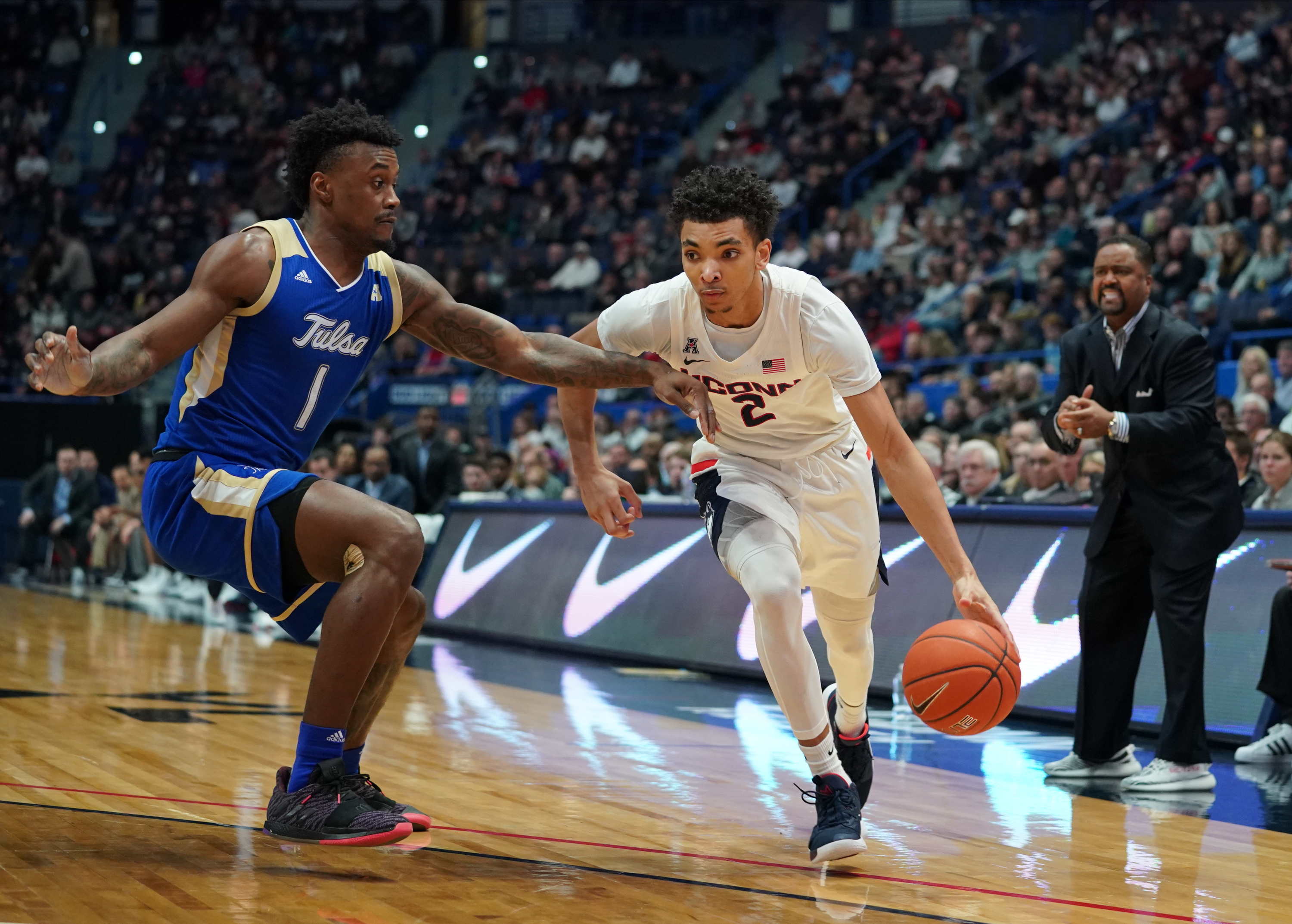 Jan 26, 2020; Hartford, Connecticut, USA; Connecticut Huskies guard James Bouknight (2) drives the ball against Tulsa Golden Hurricane forward Martins Igbanu (1) in the first half at XL Center. Mandatory Credit: David Butler II-USA TODAY Sportsundefined