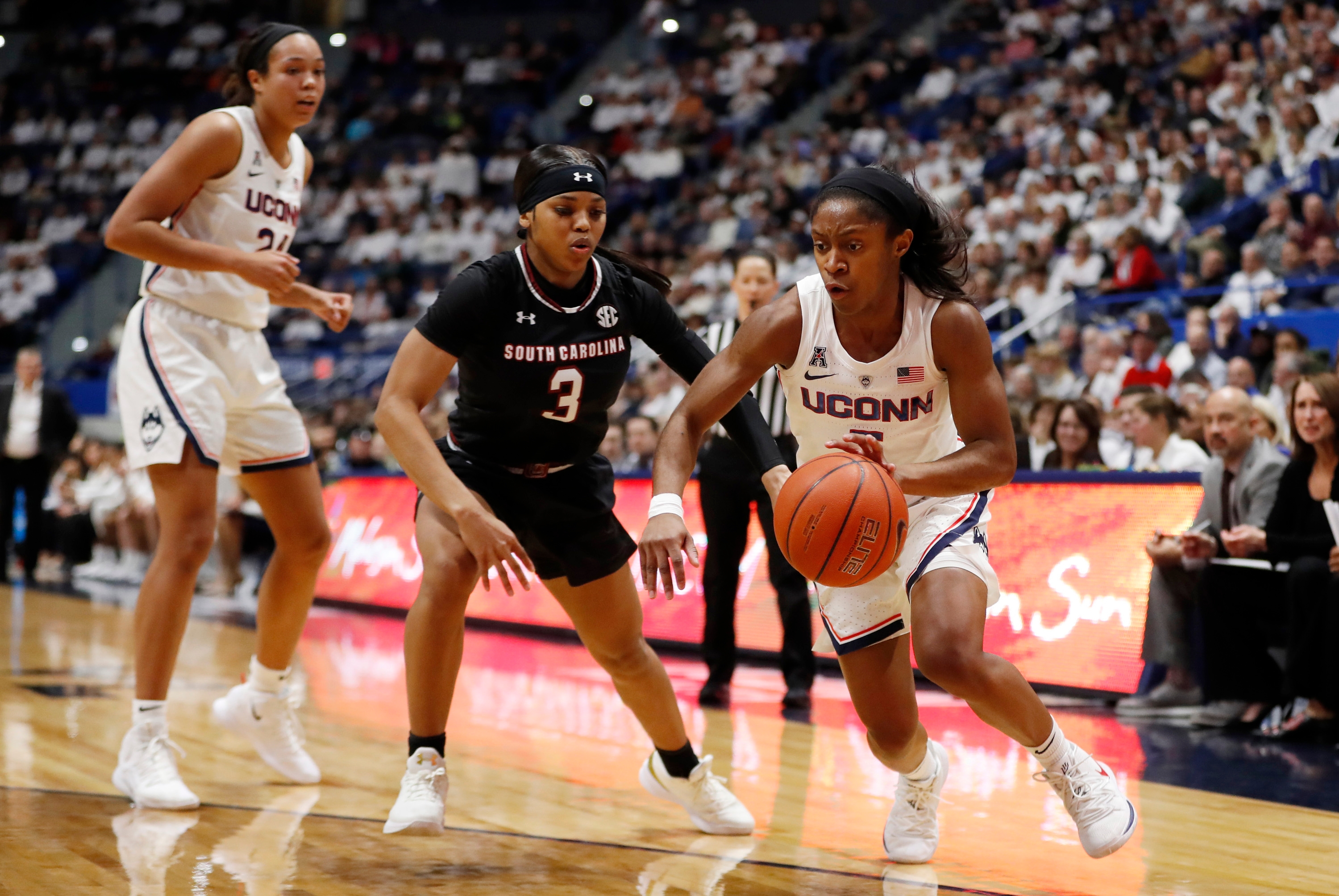 Feb 11, 2019; Hartford, CT, USA; Connecticut Huskies guard Crystal Dangerfield (5) drives the ball against South Carolina Gamecocks guard Destanni Henderson (3) in the first half at XL Center. Mandatory Credit: David Butler II-USA TODAY Sports / David Butler II