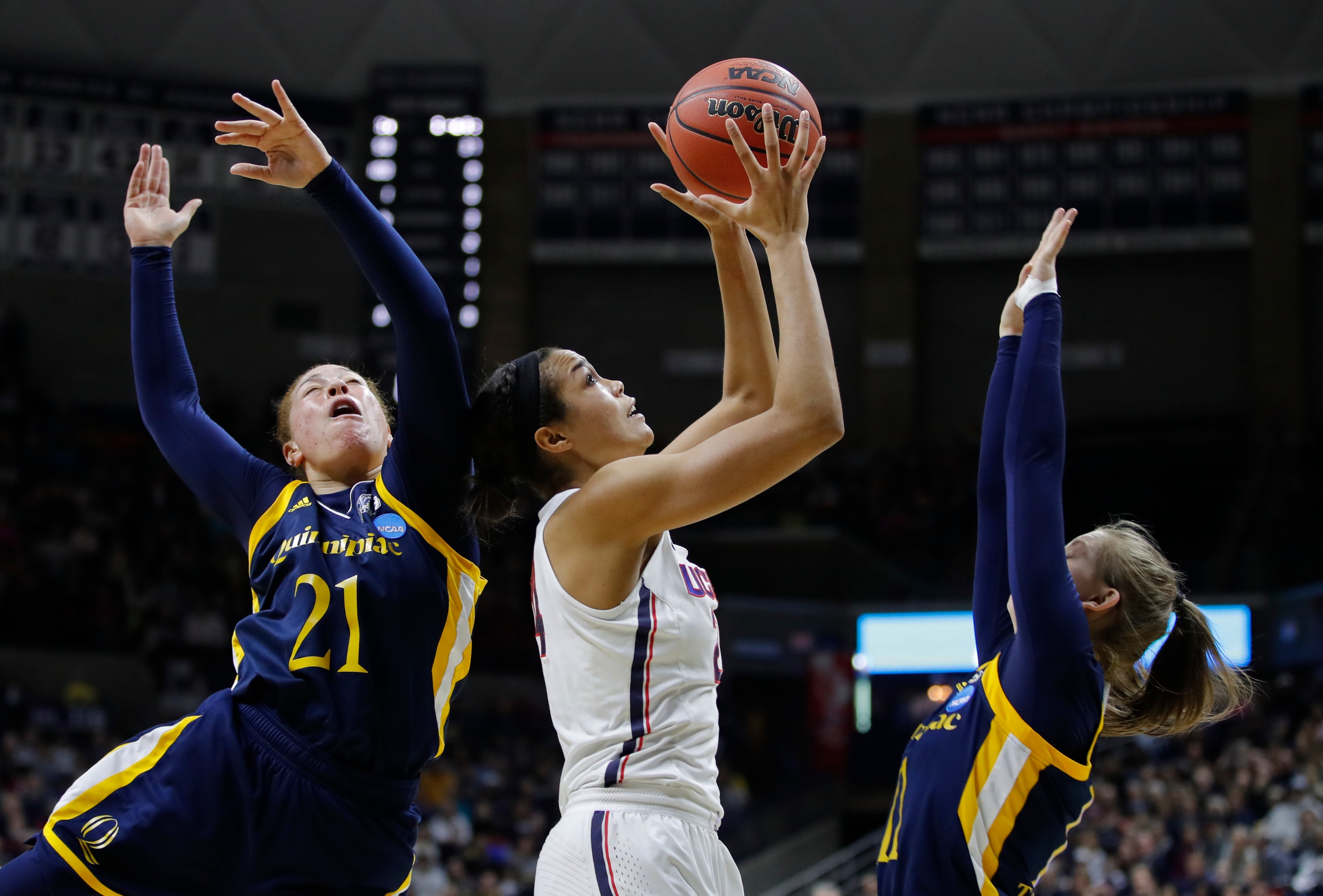 Connecticut Huskies forward Napheesa Collier attempts to control the ball as Quinnipiac Bobcats forward Jen Fay and guard Edel Thornton defend in the first half of the women's NCAA tournament second round at Gampel Pavilion. / David Butler II/USA TODAY Sports