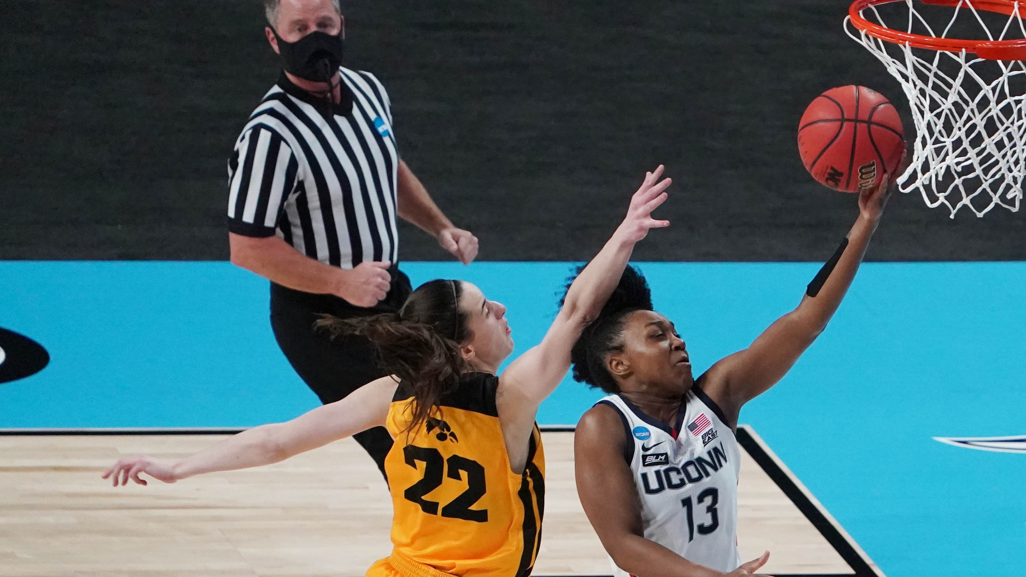 Connecticut Huskies guard Christyn Williams (13) shoots against Iowa Hawkeyes guard Caitlin Clark (22) in the Sweet Sixteen of the 2021 Women's NCAA Tournament at Alamodome. / Kirby Lee