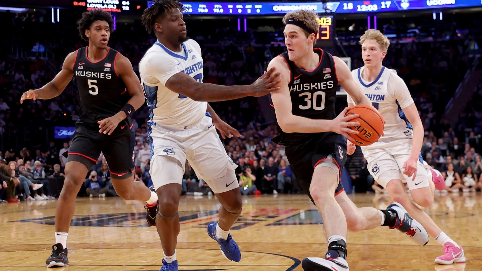 Mar 14, 2025; New York, NY, USA; Connecticut Huskies forward Liam McNeeley (30) drives to the basket against Creighton Bluejays center Fredrick King (33) and forward Jackson McAndrew (23) during the first half at Madison Square Garden. / Brad Penner-Imagn Images