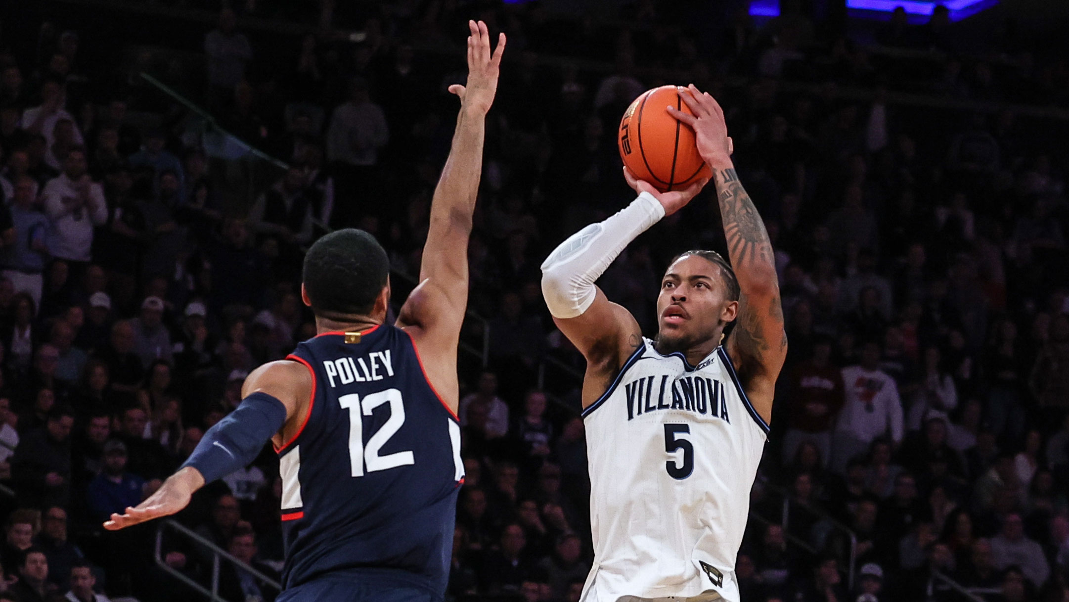 Mar 11, 2022; New York, NY, USA; Villanova Wildcats guard Justin Moore (5) shoots the ball as Connecticut Huskies forward Tyler Polley (12) defends during the first half at Madison Square Garden. / Vincent Carchietta-USA TODAY Sports