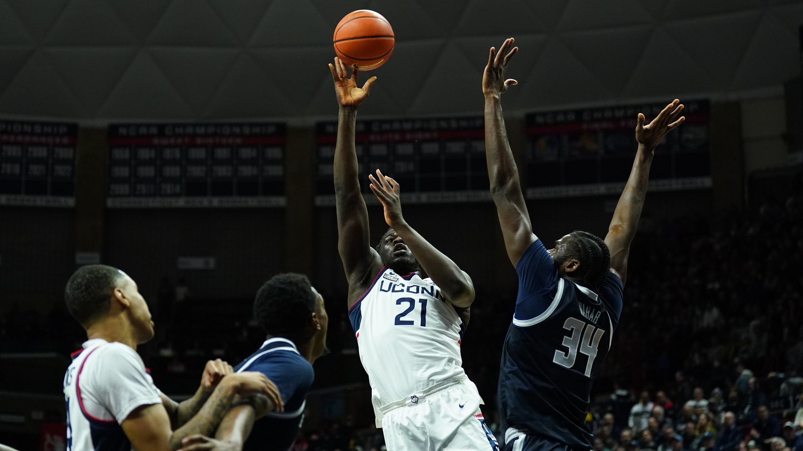 Dec 20, 2022; Storrs, Connecticut, USA; UConn Huskies forward Adama Sanogo (21) shoots against Georgetown Hoyas center Qudus Wahab (34) in the first half at Harry A. Gampel Pavilion / David Butler II-USA TODAY Sports
