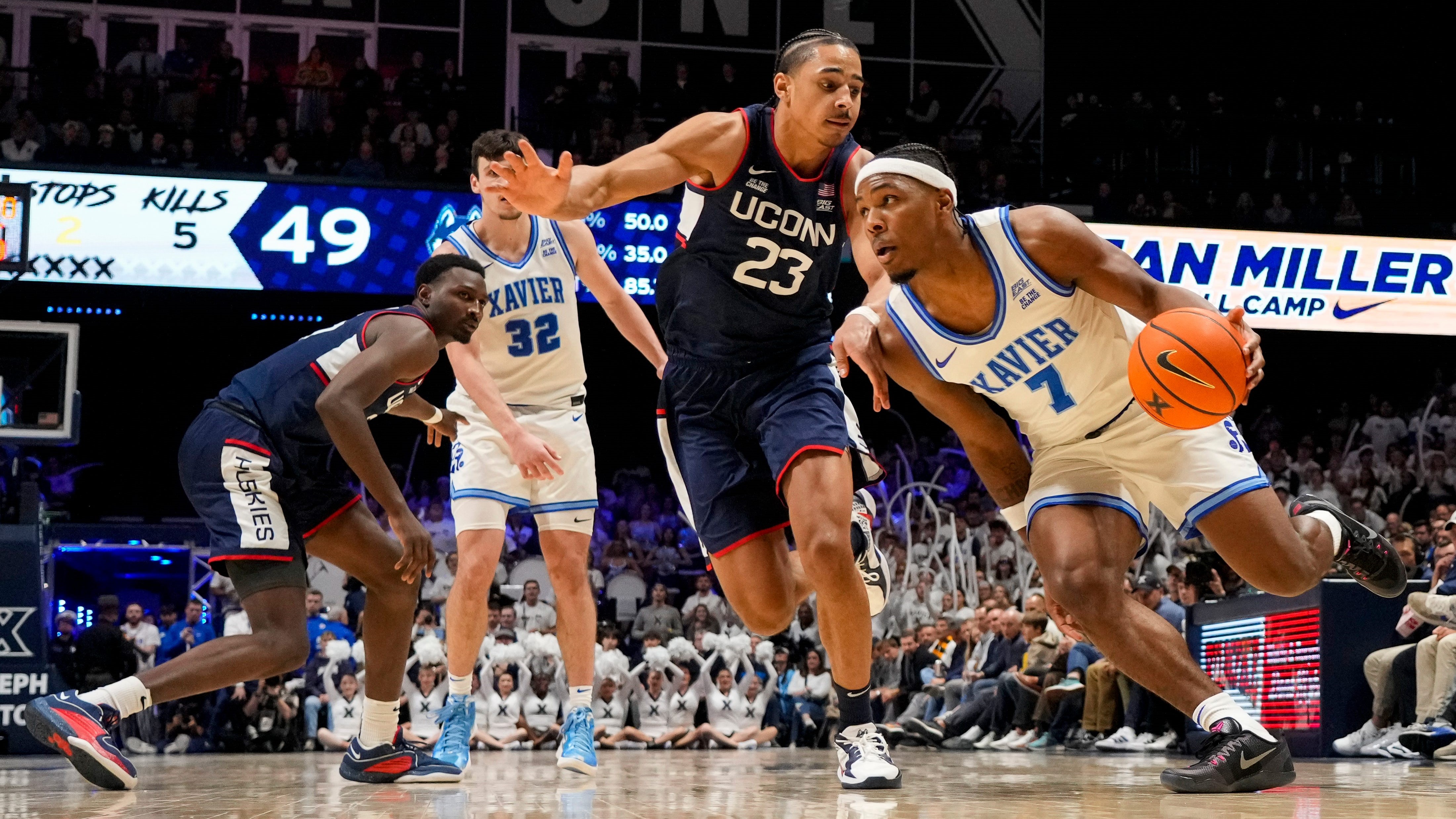Xavier Musketeers guard Ryan Conwell (7) drives to the basket in the second half of the NCAA Big East Conference basketball game between the Xavier Musketeers and the Connecticut Huskies at the Cintas Center in Cincinnati on Saturday, Jan. 25, 2025 / Sam Greene/The Enquirer / USA TODAY NETWORK via Imagn Images