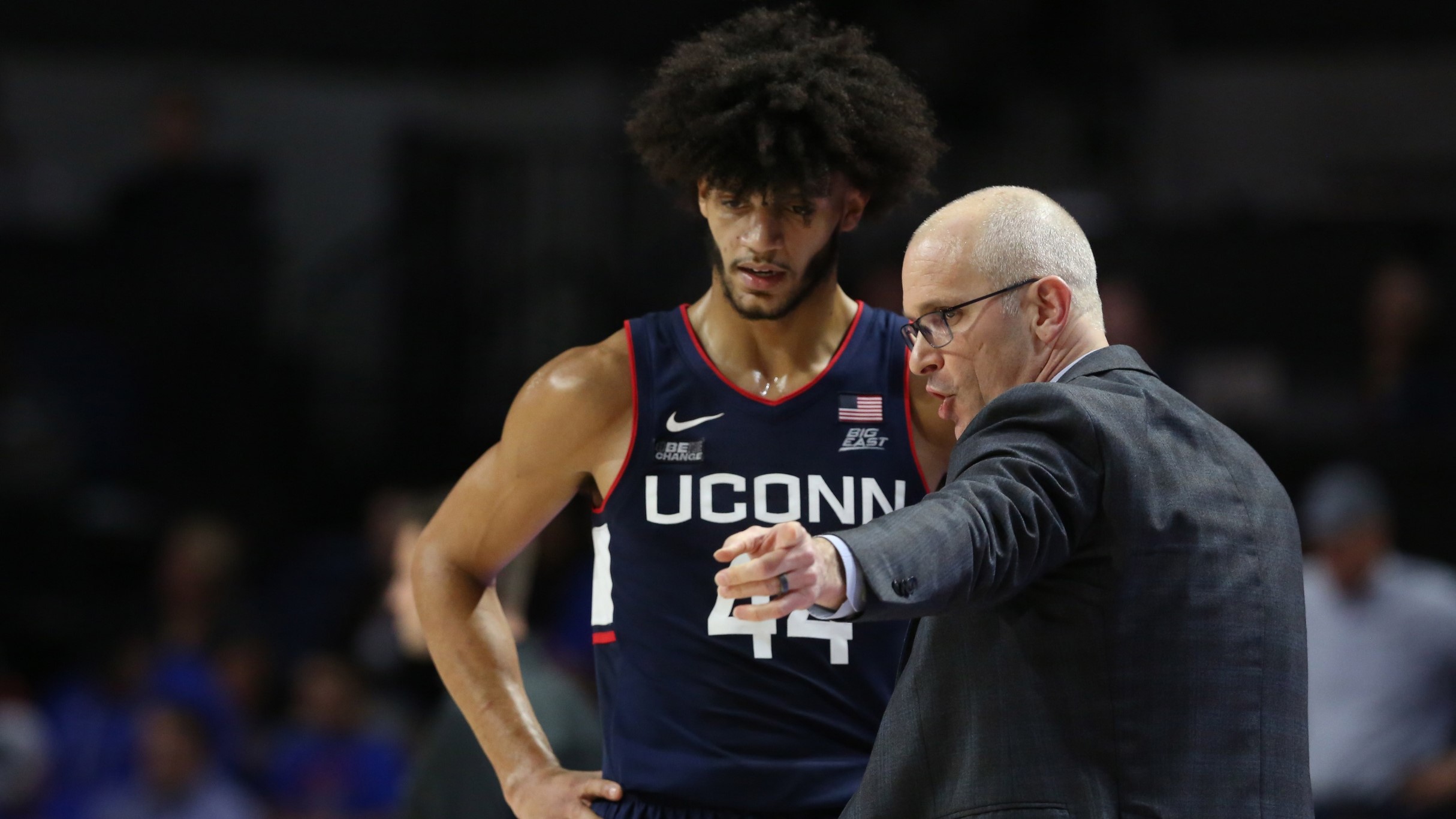 Dec 7, 2022; Gainesville, Florida, USA; Connecticut Huskies head coach Dan Hurley talks with guard Andre Jackson Jr. (44) during the second half at Exactech Arena at the Stephen C. O'Connell Center / Kim Klement-USA TODAY Sports