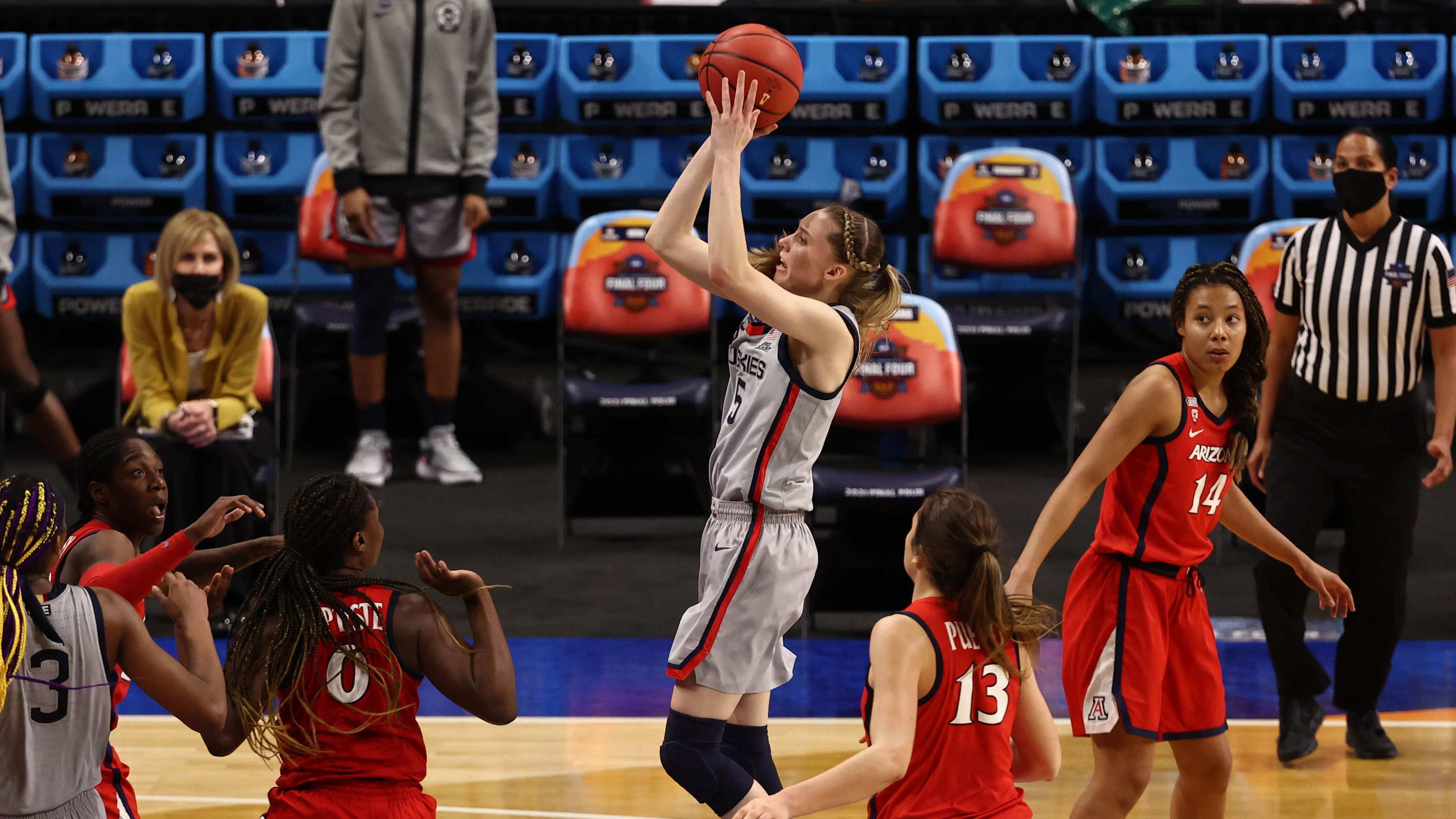 Apr 2, 2021; San Antonio, Texas, USA; UConn Huskies guard Paige Bueckers (5) shoots the ball over Arizona Wildcats forward Trinity Baptiste (0) during the second half in the national semifinals of the women's Final Four of the 2021 NCAA Tournament at Alamodome. / Troy Taormina-USA TODAY Sports