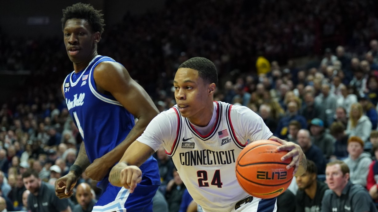 No. 20 UConn holds on to beat Seton Hall, 64-55Jordan Hawkins led the way with 20 points2/18/2023, 7:56 PMFeb 18, 2023; Storrs, Connecticut, USA; UConn Huskies guard Jordan Hawkins (24) drives the ball against Seton Hall Pirates forward Tyrese Samuel (4) in the first half at Harry A. Gampel Pavilion. / David Butler II-USA TODAY Sports