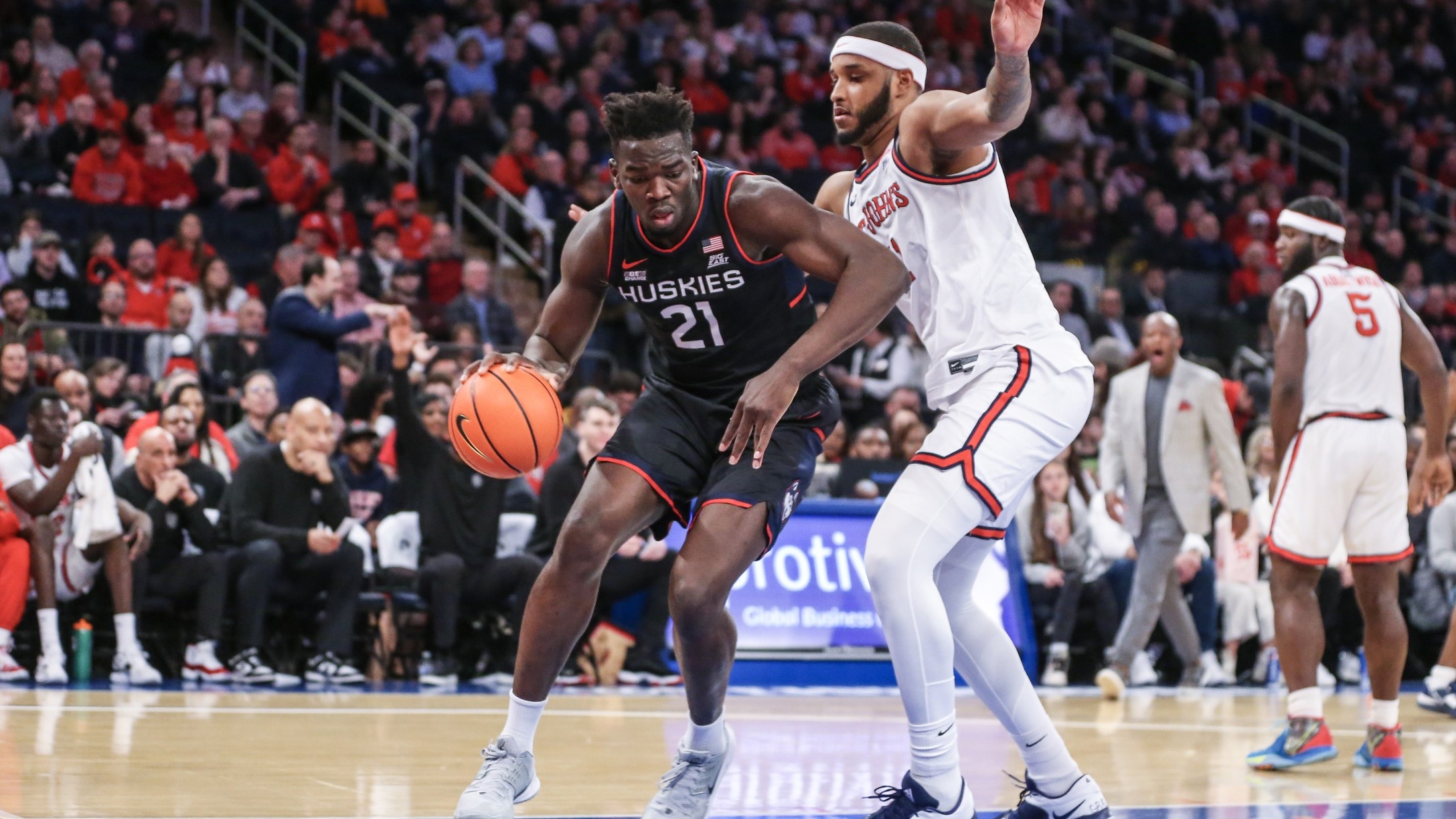 Feb 25, 2023; New York, New York, USA; Connecticut Huskies forward Adama Sanogo (21) fights for position against St. John's Red Storm center Joel Soriano (11) in the first half at Madison Square Garden. / Wendell Cruz-USA TODAY Sports