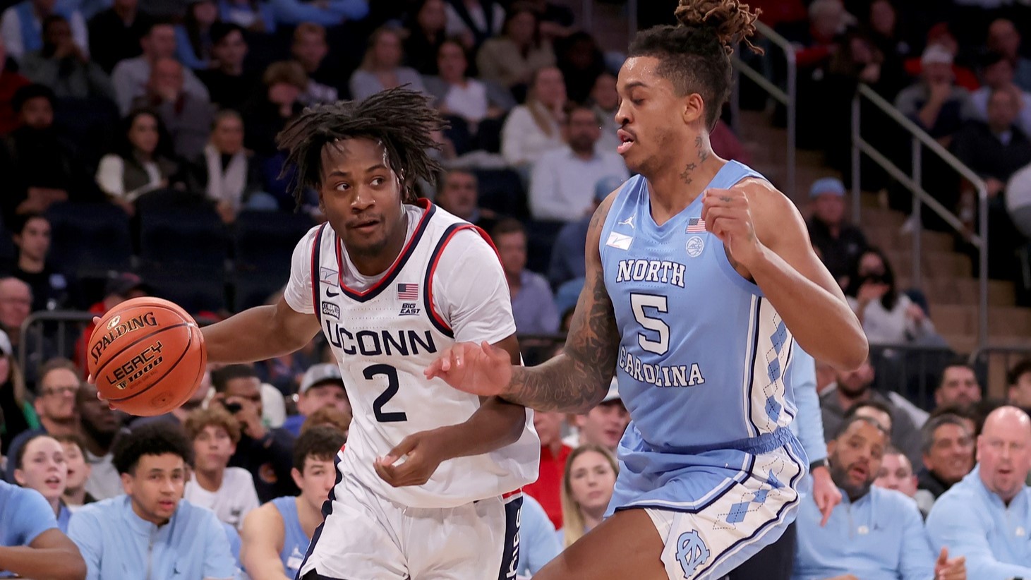 Second-half surge propels No. 5 UConn to 87-76 win over No. 9 UNC in Jimmy V ClassicCam Spencer led the way for UConn with 23 points12/6/2023, 4:57 AMAssociated PressDec 5, 2023; New York, New York, USA; Connecticut Huskies guard Tristen Newton (2) controls the ball against North Carolina Tar Heels forward Armando Bacot (5) during the first half at Madison Square Garden. / Brad Penner-USA TODAY Sports
