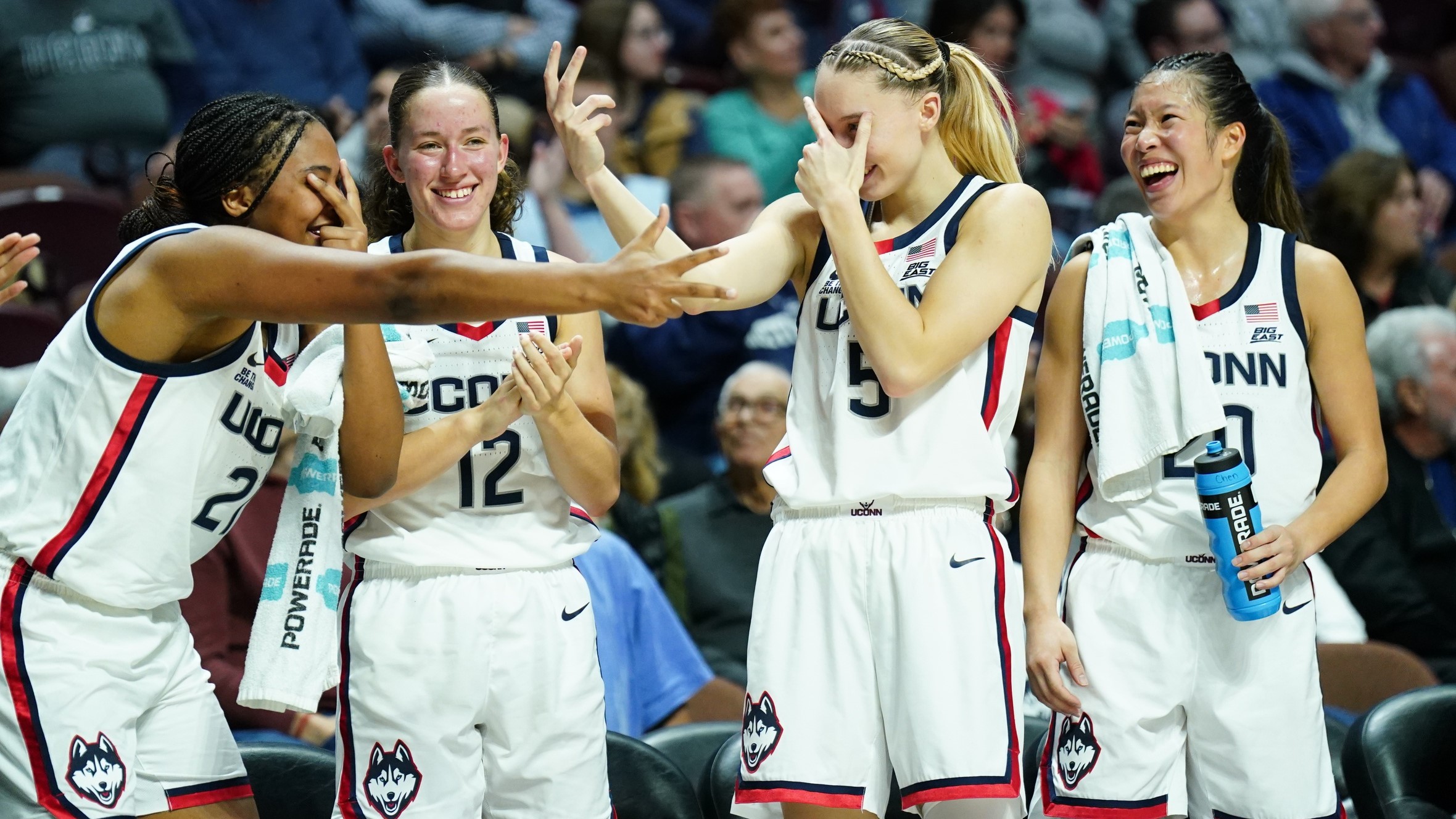 Dec 17, 2024; Uncasville, Connecticut, USA; (lL to R) UConn Huskies forward Sarah Strong (21), guard Ashlynn Shade (12), guard Paige Bueckers (5) and guard Kaitlyn Chen (20) react after a three point basket against the Iowa State Cyclones in the first half at Mohegan Sun Arena. / David Butler II-Imagn Images