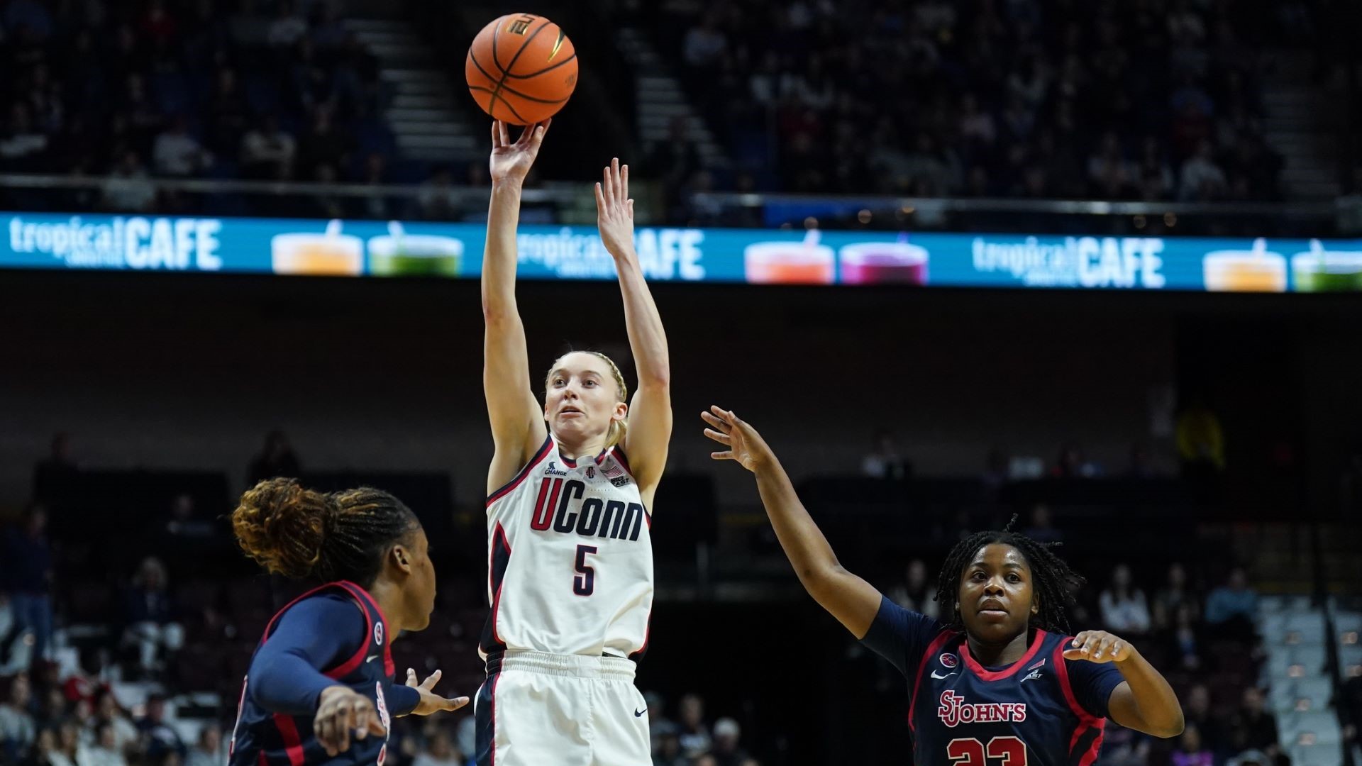 No. 3 UConn knocks off St. John's, 71-40, to advance to Big East Tournament semifinalsPaige Bueckers led the way with 20 points, five rebounds, and three assists3/8/2025, 7:12 PMAssociated PressMar 8, 2025; Uncasville, CT, USA; UConn Huskies guard Paige Bueckers (5) shoots the ball against St. John's Red Storm guard Ber'Nyah Mayo (23) in the first half at Mohegan Sun Arena. / David Butler II-Imagn Images