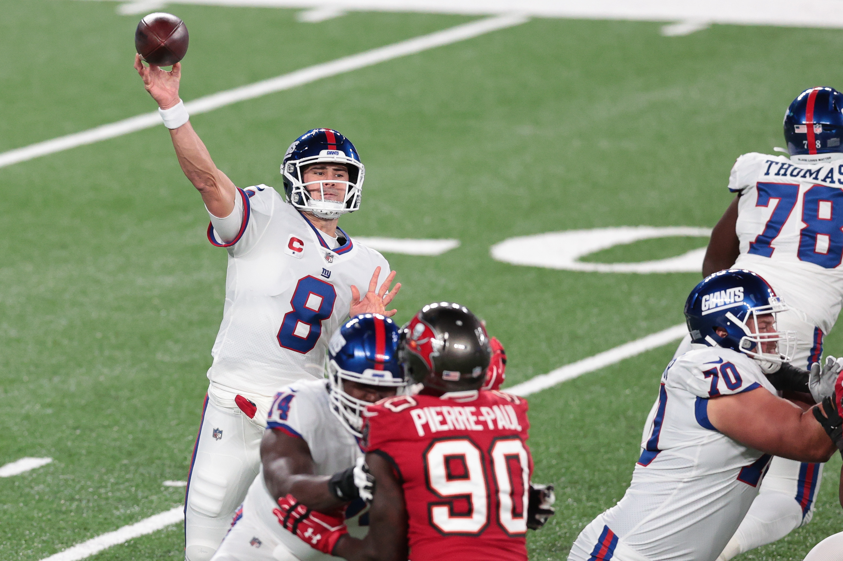 Nov 2, 2020; East Rutherford, New Jersey, USA; New York Giants running back Dion Lewis (33) catches a touchdown pass in front of New York Giants cornerback Madre Harper (45) during the first quarter at MetLife Stadium / Vincent Carchietta-USA TODAY Sports