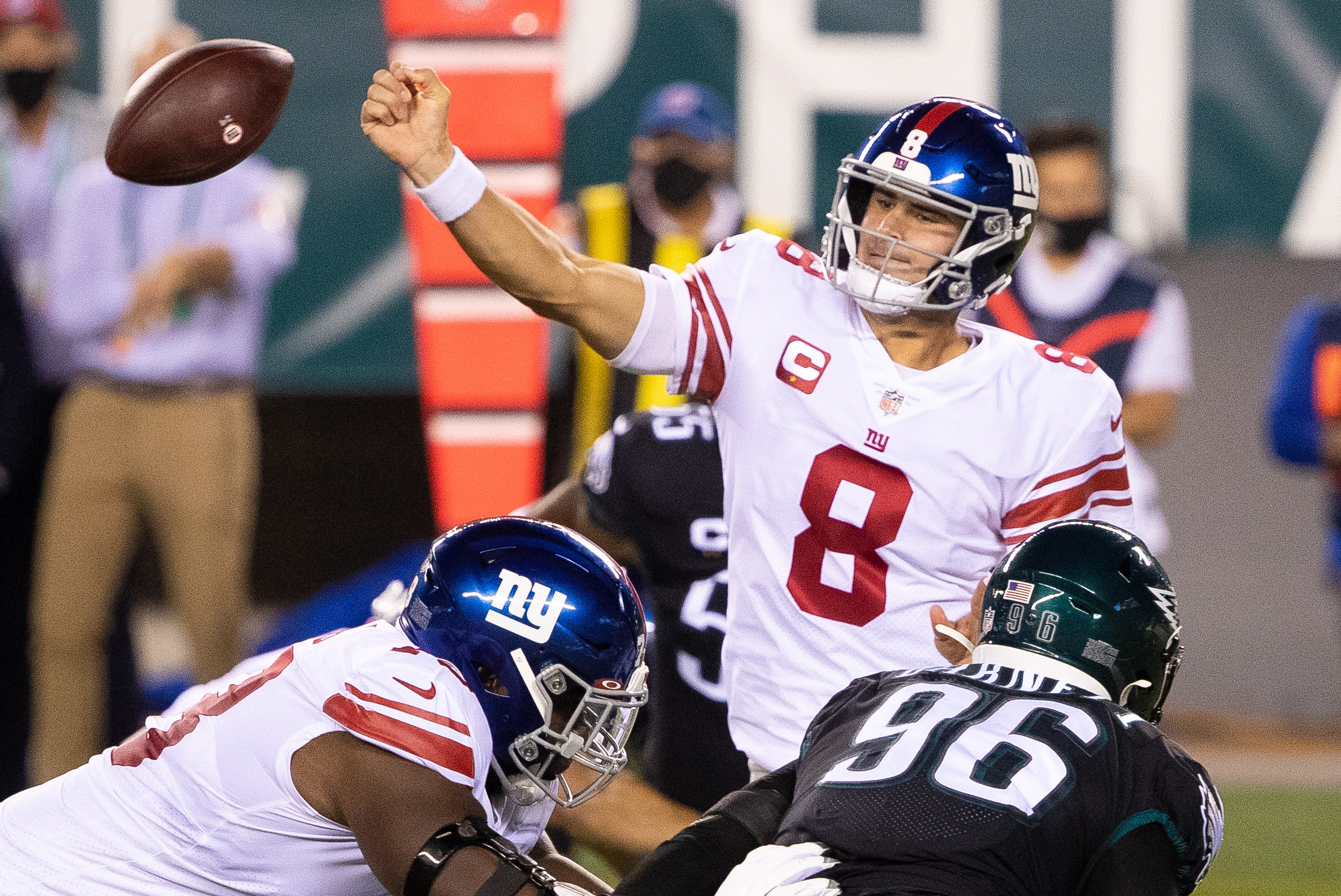 Oct 22, 2020; Philadelphia, Pennsylvania, USA; New York Giants quarterback Daniel Jones (8) looses control of the ball while passing against the Philadelphia Eagles during the second quarter at Lincoln Financial Field. / Bill Streicher-USA TODAY Sports