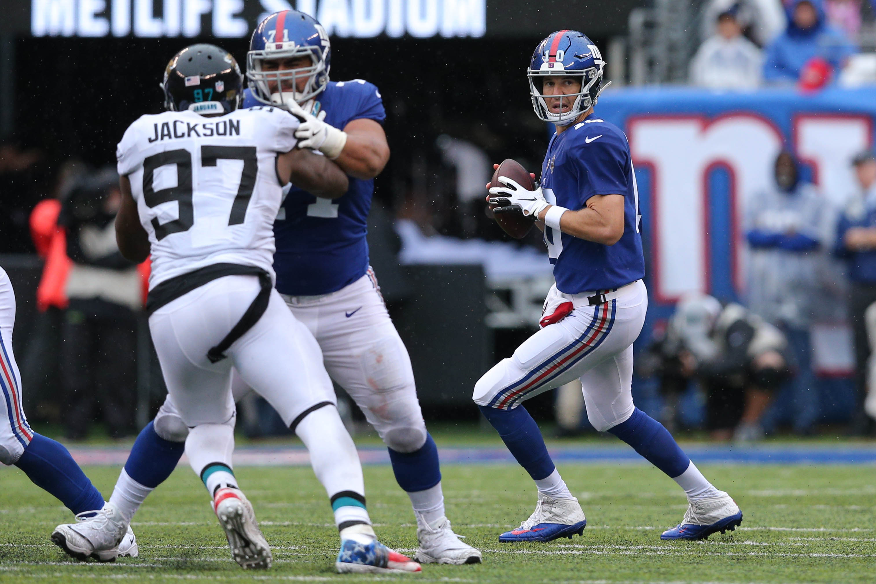Sep 9, 2018; East Rutherford, NJ, USA; New York Giants quarterback Eli Manning (10) drops back to pass against the Jacksonville Jaguars during the second quarter at MetLife Stadium. Mandatory Credit: Brad Penner-USA TODAY Sports / Brad Penner