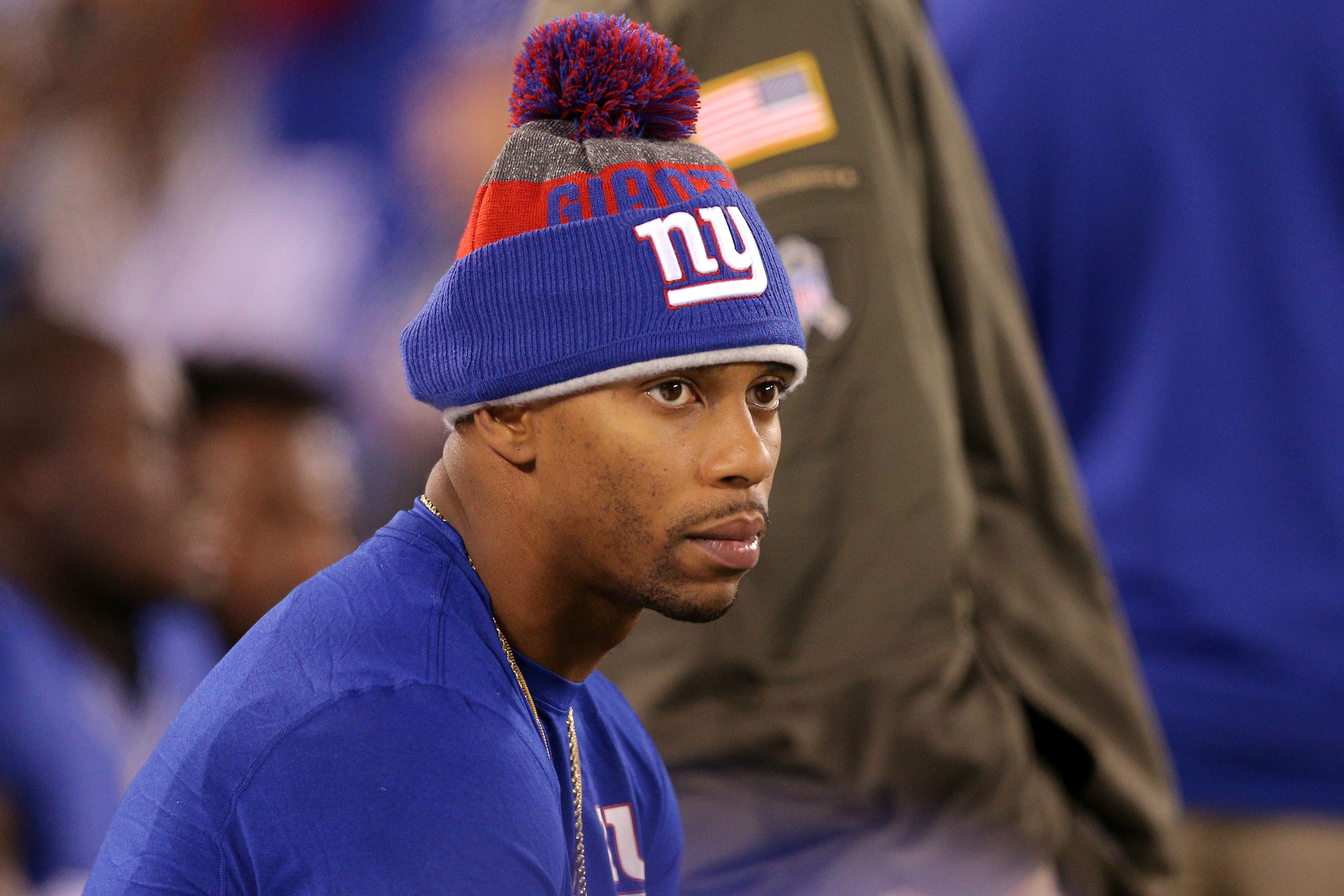 Nov 14, 2016; East Rutherford, NJ, USA; New York Giants wide receiver Victor Cruz (80) sits on the bench during the third quarter against the Cincinnati Bengals at MetLife Stadium. Mandatory Credit: Brad Penner-USA TODAY Sports / Brad Penner