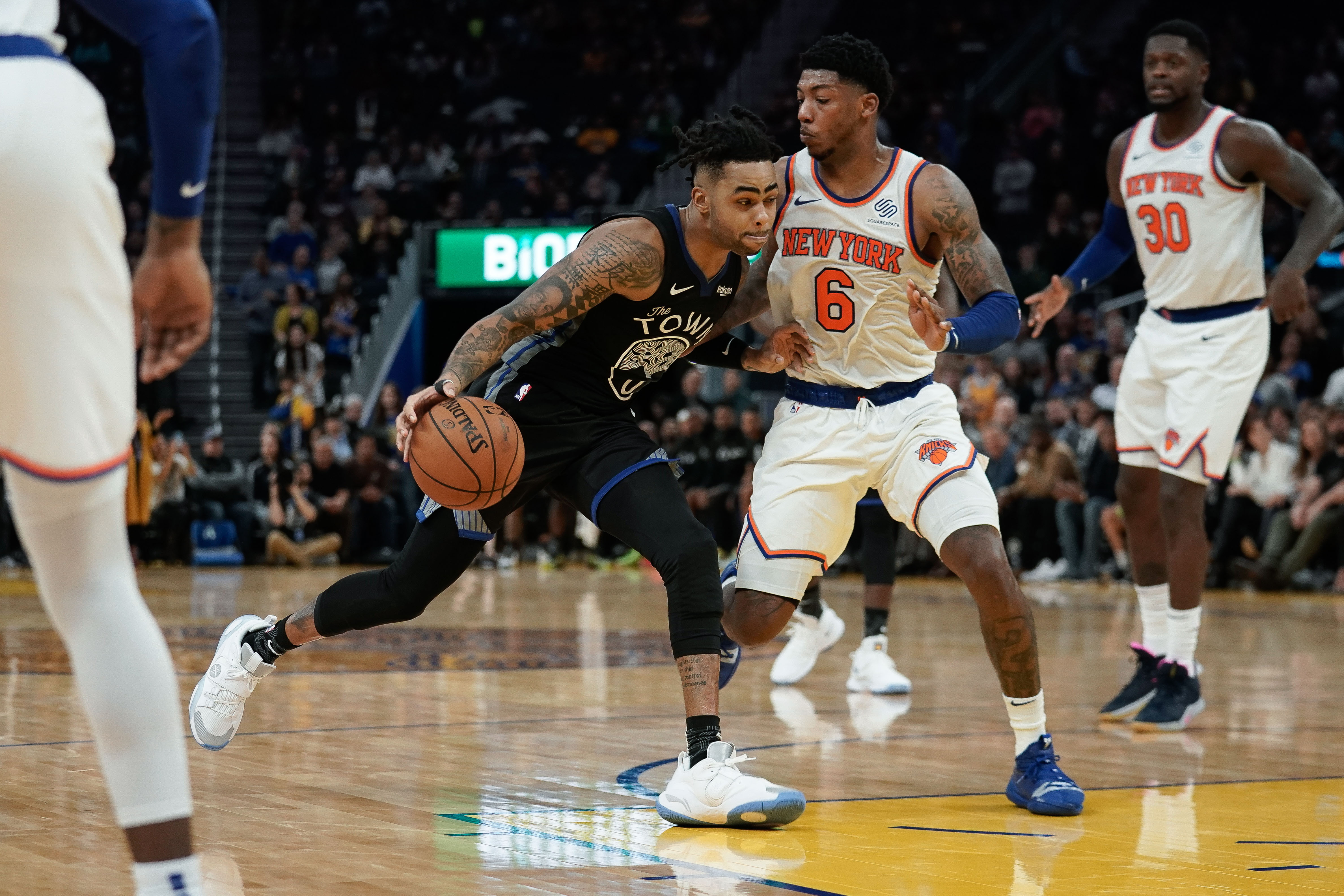 Dec 11, 2019; San Francisco, CA, USA; Golden State Warriors guard D'Angelo Russell (0) drives the ball against New York Knicks guard Elfrid Payton (6) during overtime at Chase Center. Mandatory Credit: Stan Szeto-USA TODAY Sports / Stan Szeto
