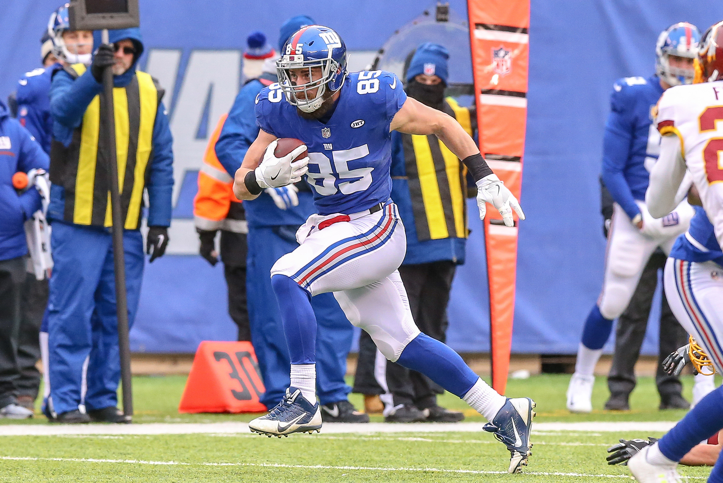 Dec 31, 2017; East Rutherford, NJ, USA; New York Giants tight end Rhett Ellison (85) rushes for yards after a catch against the Washington Redskins during the first half at MetLife Stadium. Mandatory Credit: Vincent Carchietta-USA TODAY Sports / Vincent Carchietta