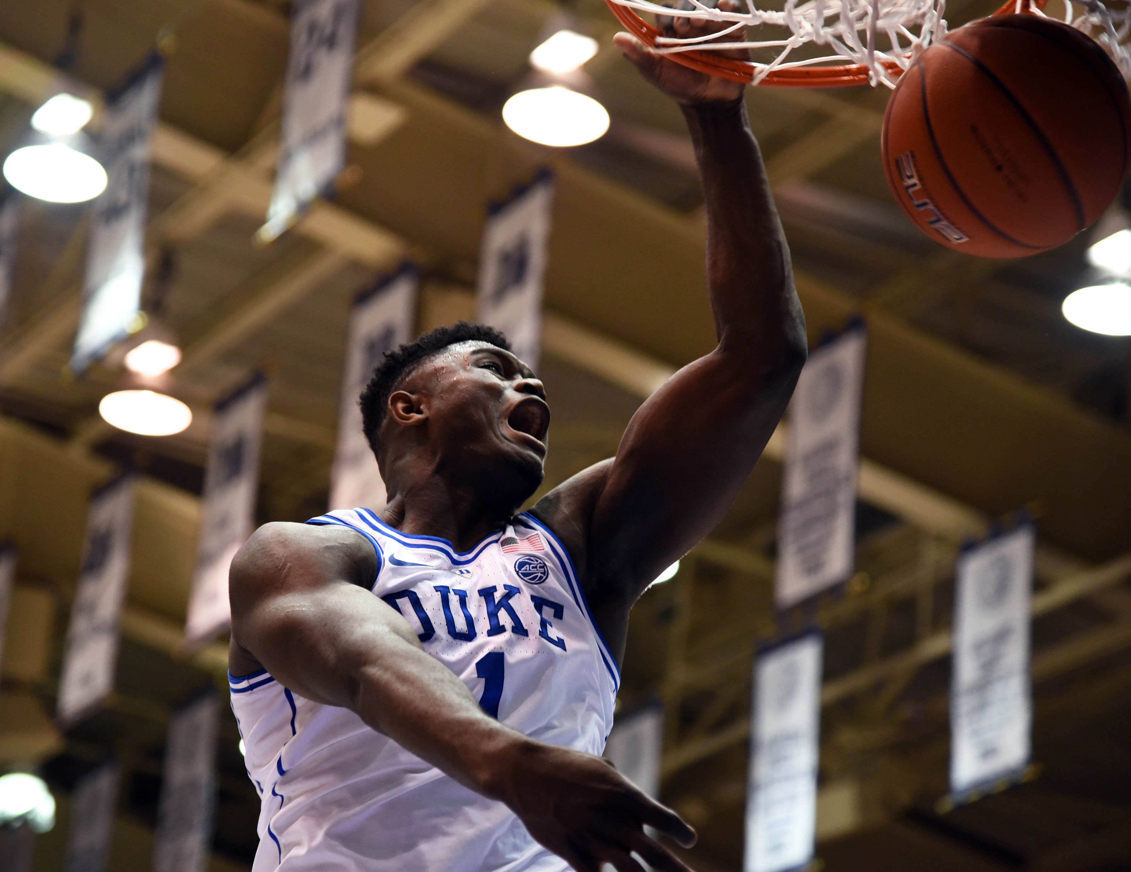 Nov 27, 2018; Durham, NC, USA; Duke Blue Devils forward Zion Williamson (1) dunks during the first half against the Indiana Hoosiers at Cameron Indoor Stadium. Mandatory Credit: Rob Kinnan-USA TODAY Sports / Rob Kinnan