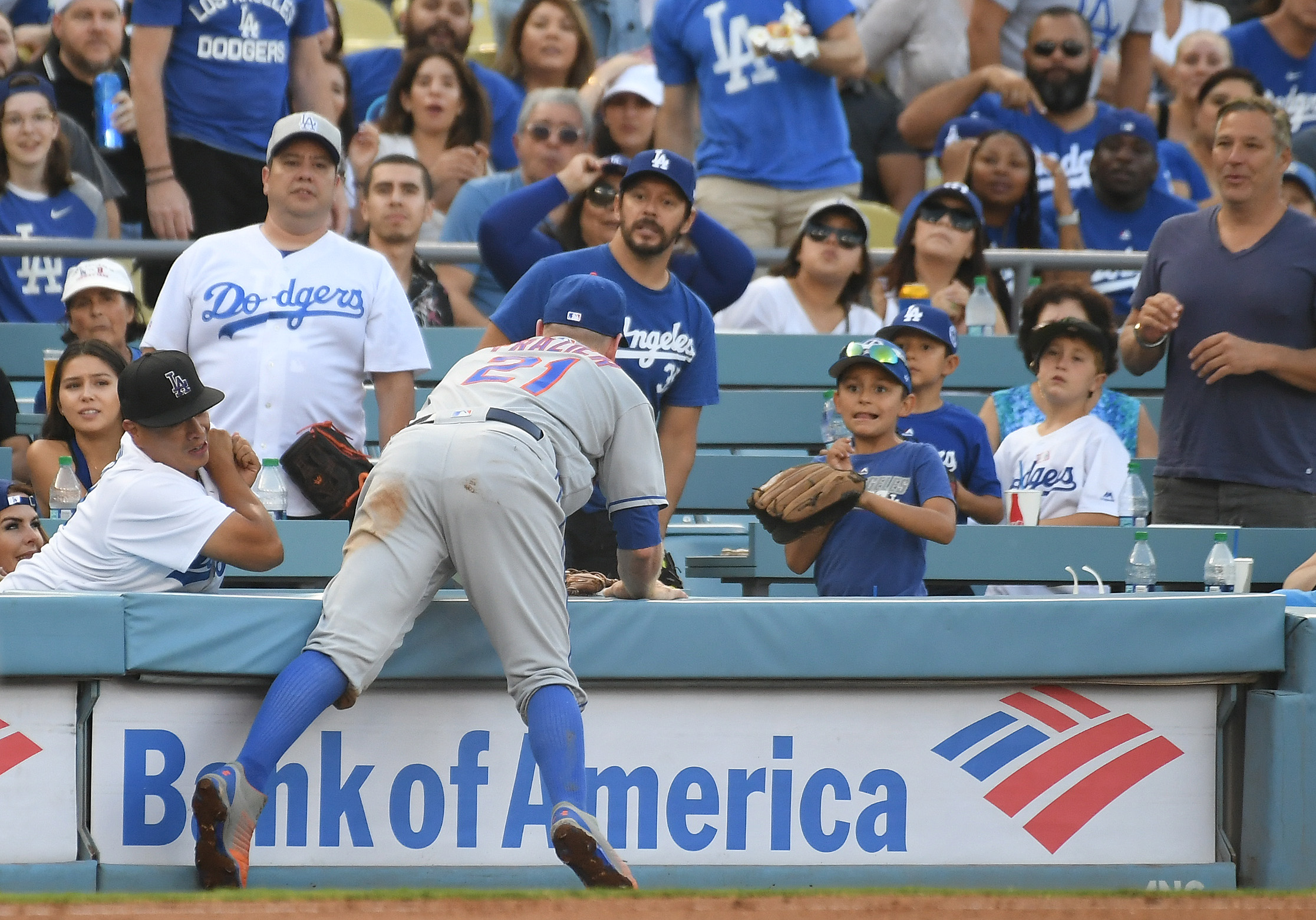 Sep 3, 2018; Los Angeles, CA, USA; New York Mets third baseman Todd Frazier (21) goes over the wall to catch a ball hit by Los Angeles Dodgers center fielder Alex Verdugo (61) in the second inning at Dodger Stadium. Mandatory Credit: Richard Mackson-USA TODAY Sports / Richard Mackson