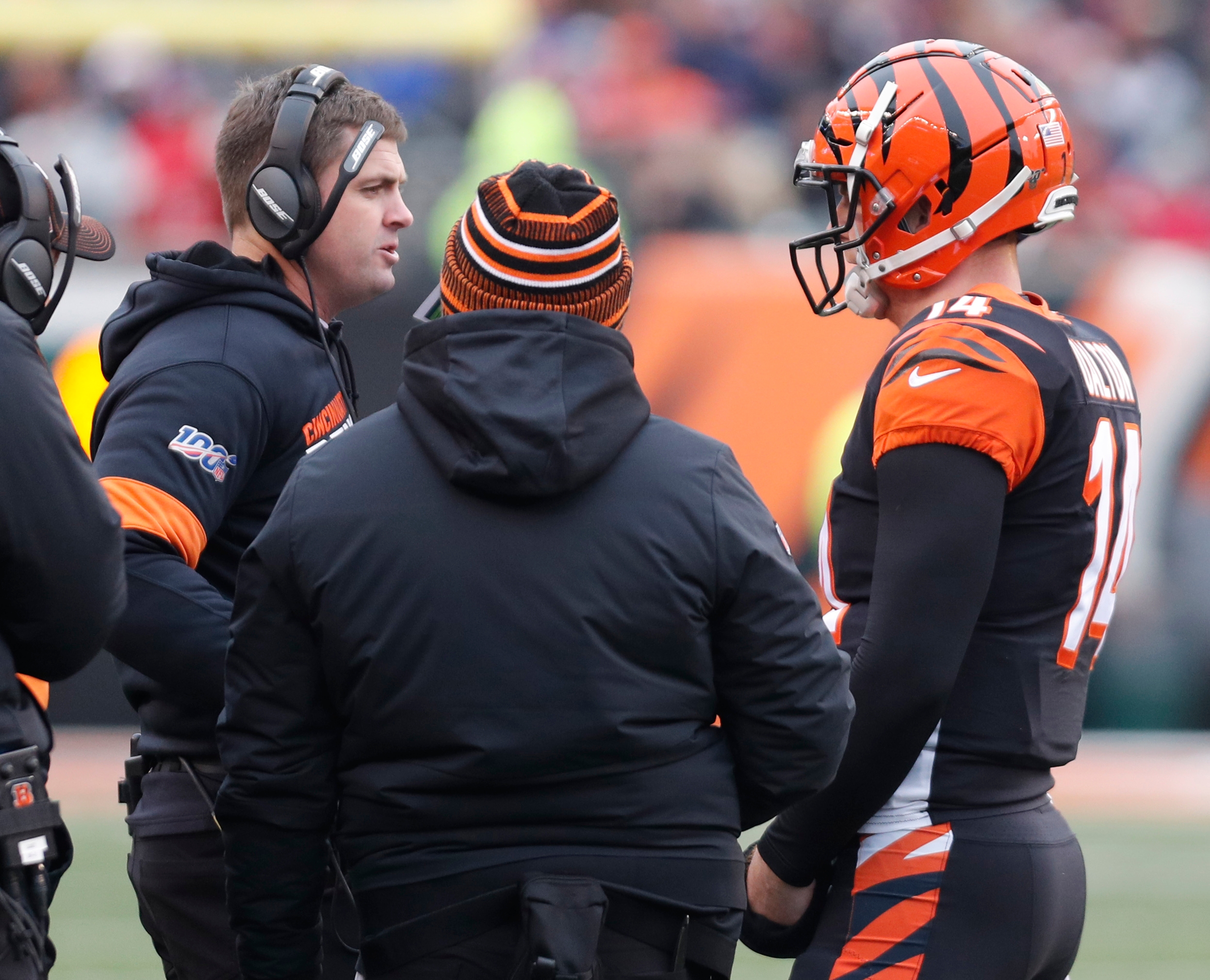 Dec 15, 2019; Cincinnati, OH, USA; Cincinnati Bengals head coach Zac Taylor (left) talks with quarterback Andy Dalton (14) during the second half against the New England Patriots at Paul Brown Stadium. Mandatory Credit: David Kohl-USA TODAY Sports / David Kohl