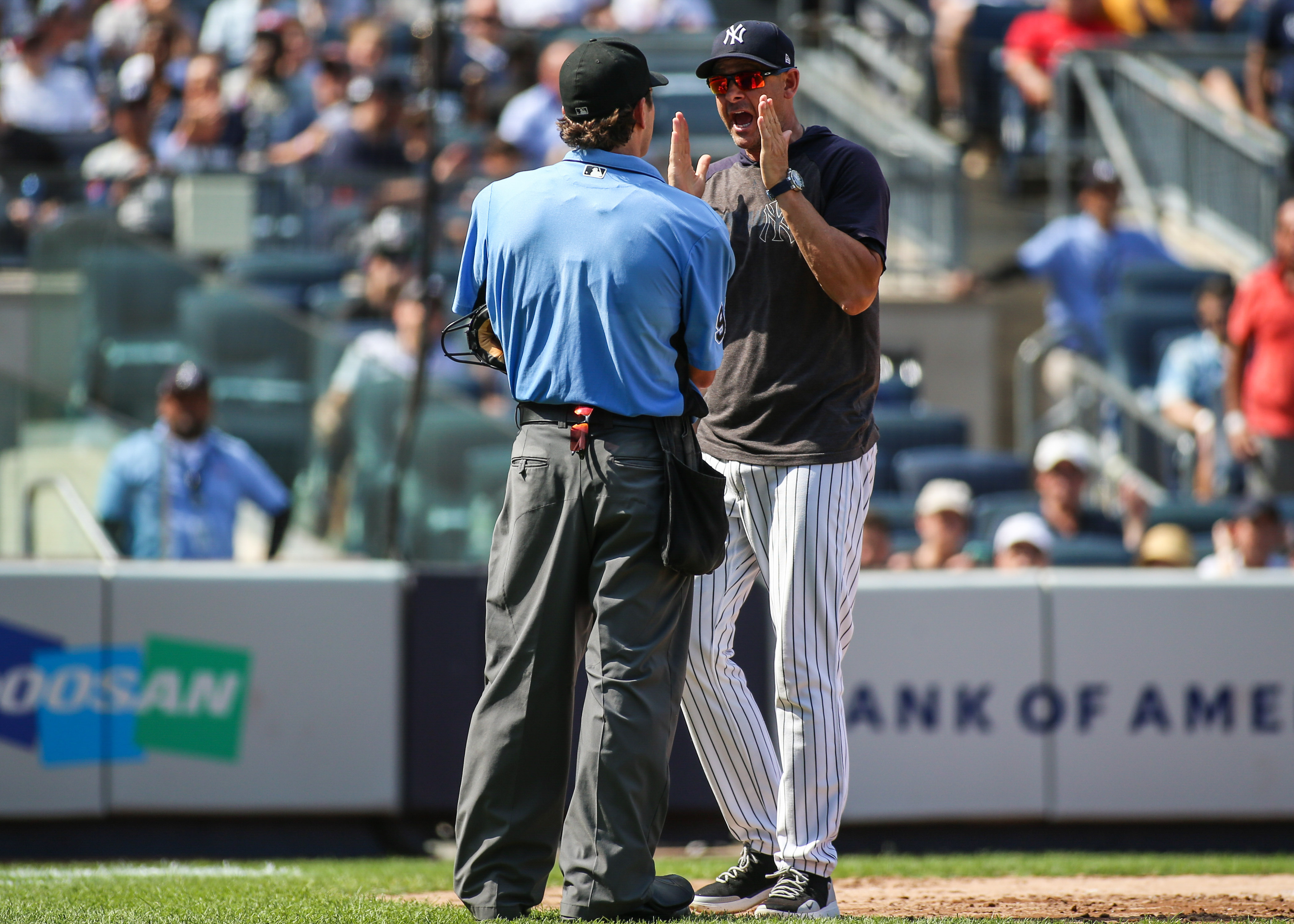 WATCH: Yankees manager Aaron Boone gets ejected for 5th time of 2019Boone argued balls, strikes until umpires at third and home had enough9/21/2019, 5:45 PMAug 17, 2019; Bronx, NY, USA; New York Yankees manager Aaron Boone (17) at Yankee Stadium. Mandatory Credit: Wendell Cruz-USA TODAY Sports / Wendell Cruz