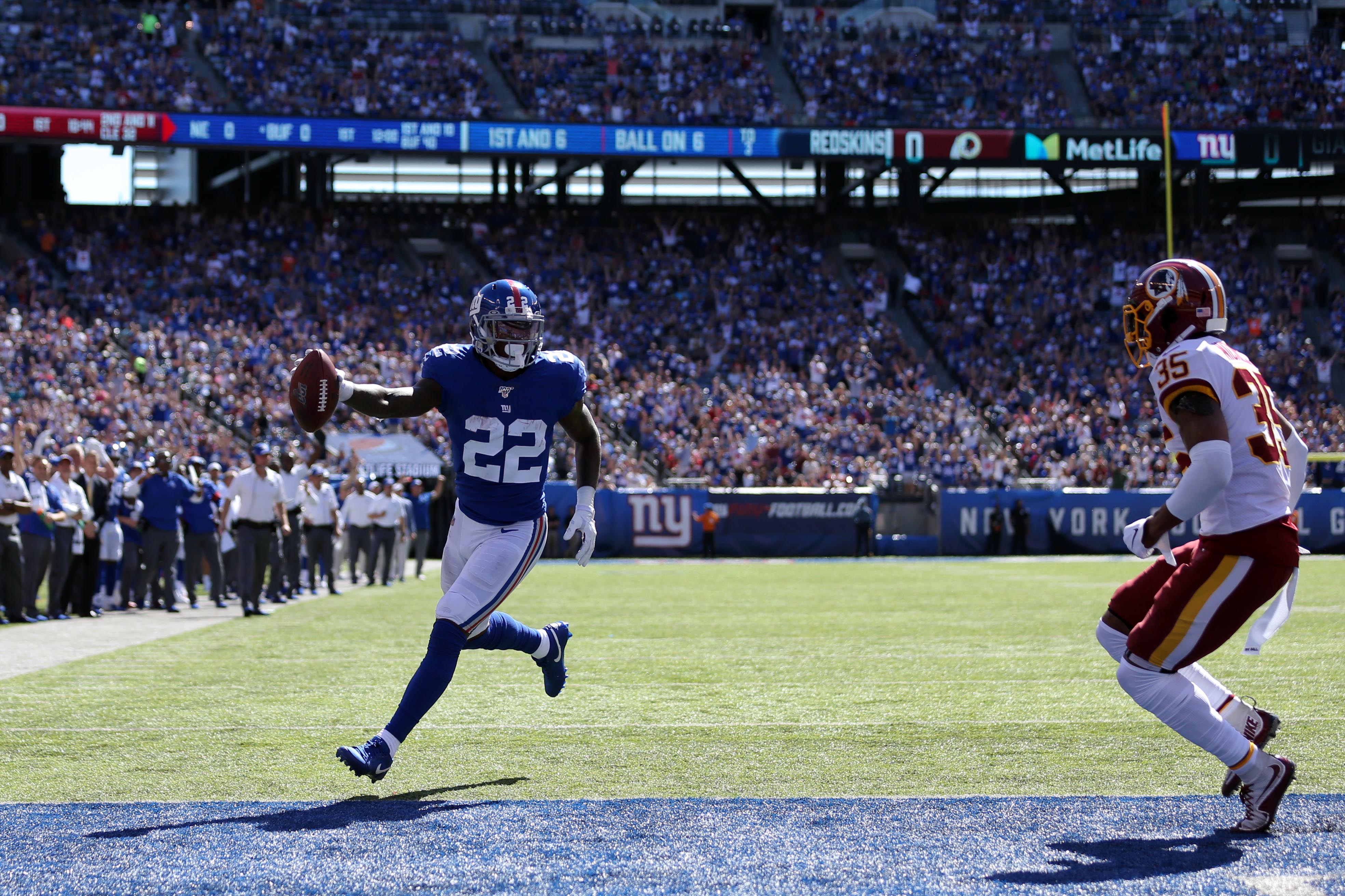Sep 29, 2019; East Rutherford, NJ, USA; New York Giants running back Wayne Gallman (22) runs for a touchdown against Washington Redskins safety Montae Nicholson (35) during the first quarter at MetLife Stadium. Mandatory Credit: Brad Penner-USA TODAY Sports / Brad Penner