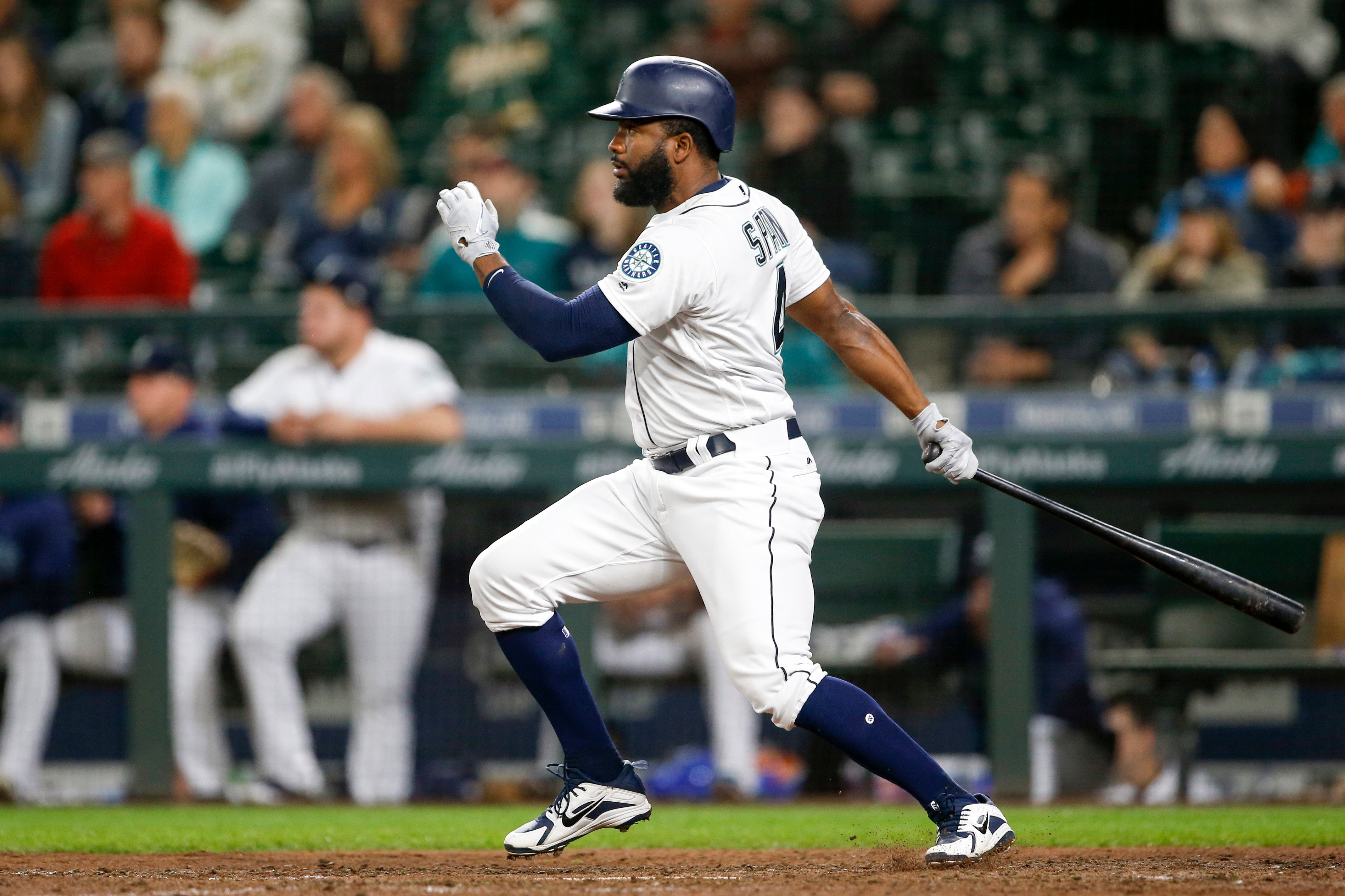 Sep 25, 2018; Seattle, WA, USA; Seattle Mariners left fielder Denard Span (4) hits a two-run double against the Oakland Athletics during the eighth inning at Safeco Field. Mandatory Credit: Joe Nicholson-USA TODAY Sports / Joe Nicholson