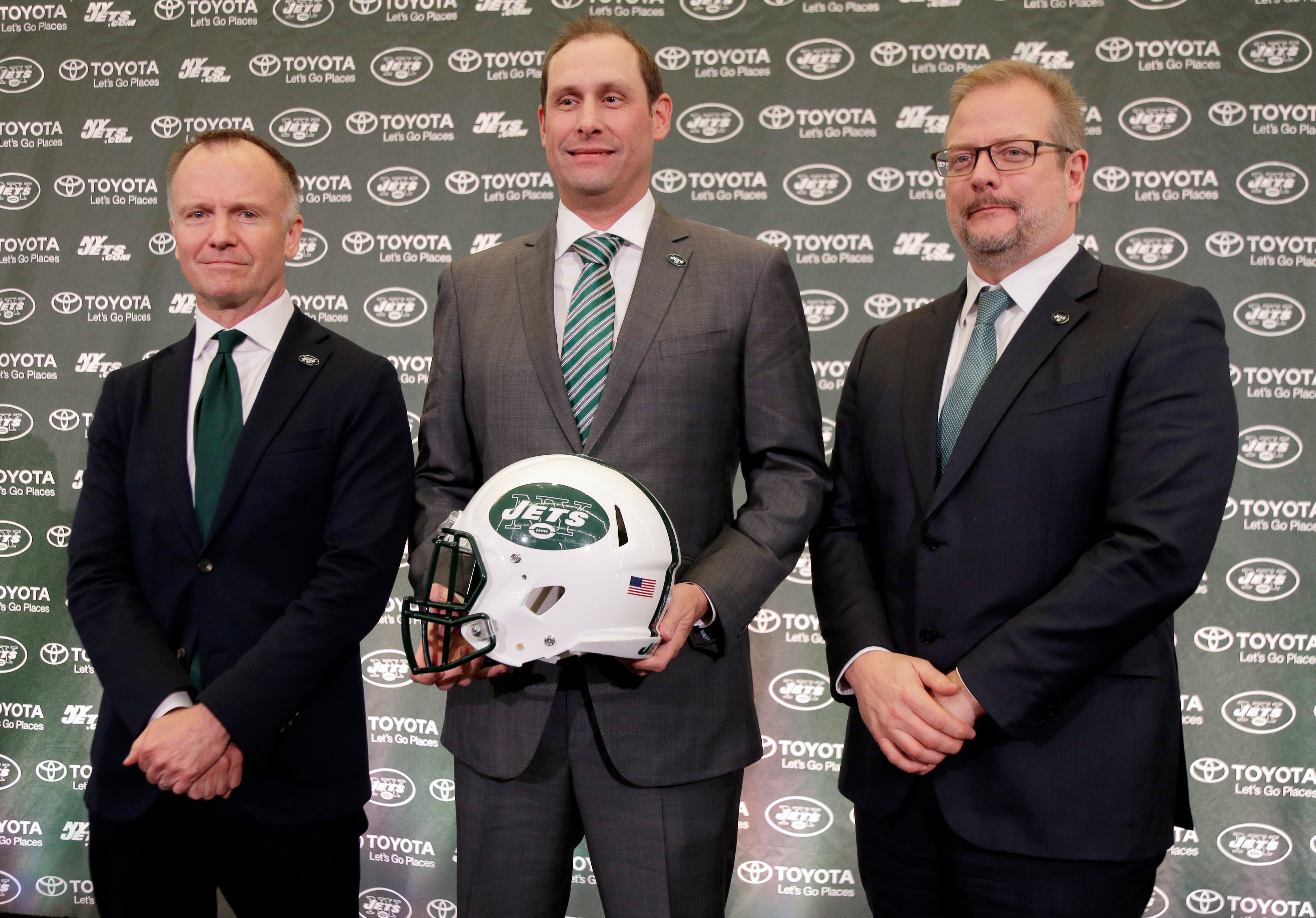 New York Jets head coach Adam Gase, center, poses for a picture with owner Christopher Johnson, left, and general manager Mike Maccagnan pose for a picture during a news conference in Florham Park, N.J., Monday, Jan. 14, 2019. (AP Photo/Seth Wenig) / Seth Wenig/AP