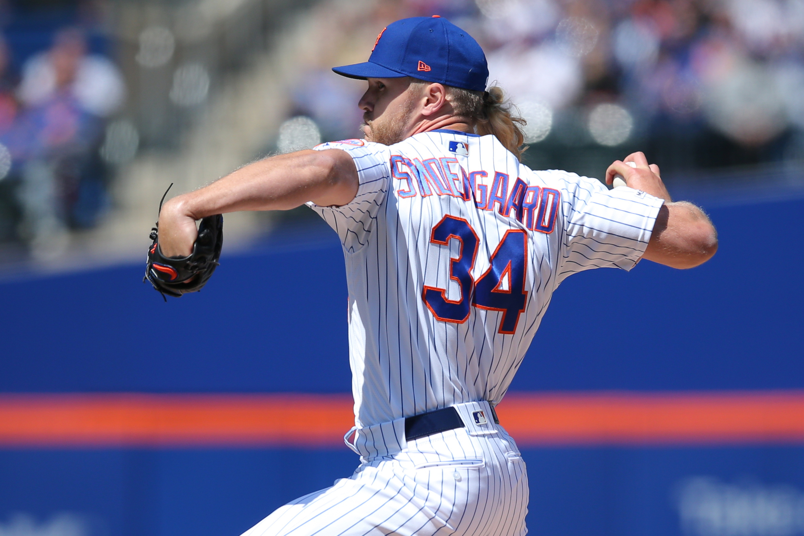 Apr 4, 2019; New York City, NY, USA; New York Mets starting pitcher Noah Syndergaard (34) pitches against the Washington Nationals during the first inning at Citi Field. Mandatory Credit: Brad Penner-USA TODAY Sports / Brad Penner