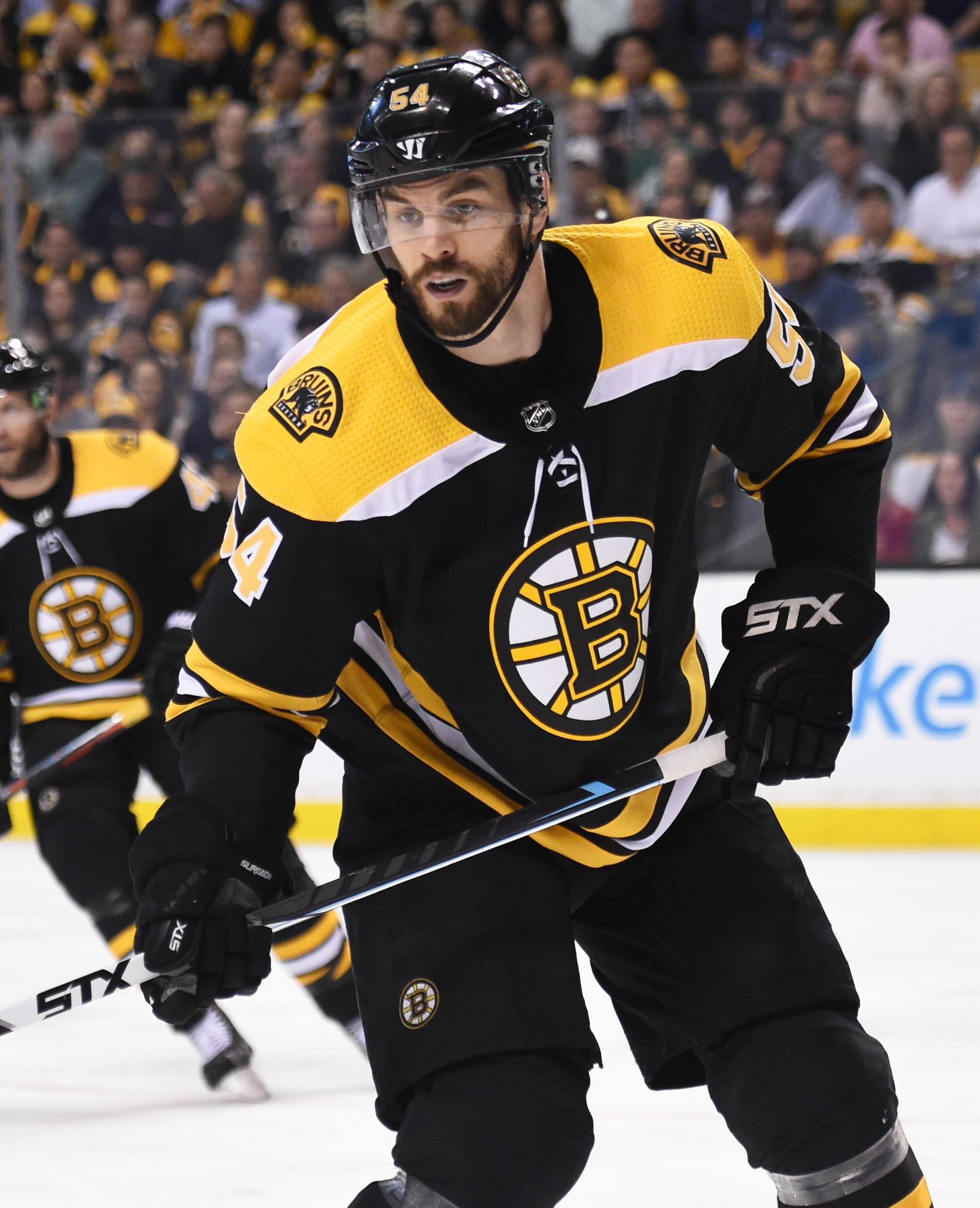 May 4, 2018; Boston, MA, USA; Boston Bruins defenseman Adam McQuaid (54) follows the play during the first period in game four of the second round of the 2018 Stanley Cup Playoffs against the Tampa Bay Lightning at TD Garden. Mandatory Credit: Bob DeChiara-USA TODAY Sports / Bob DeChiara