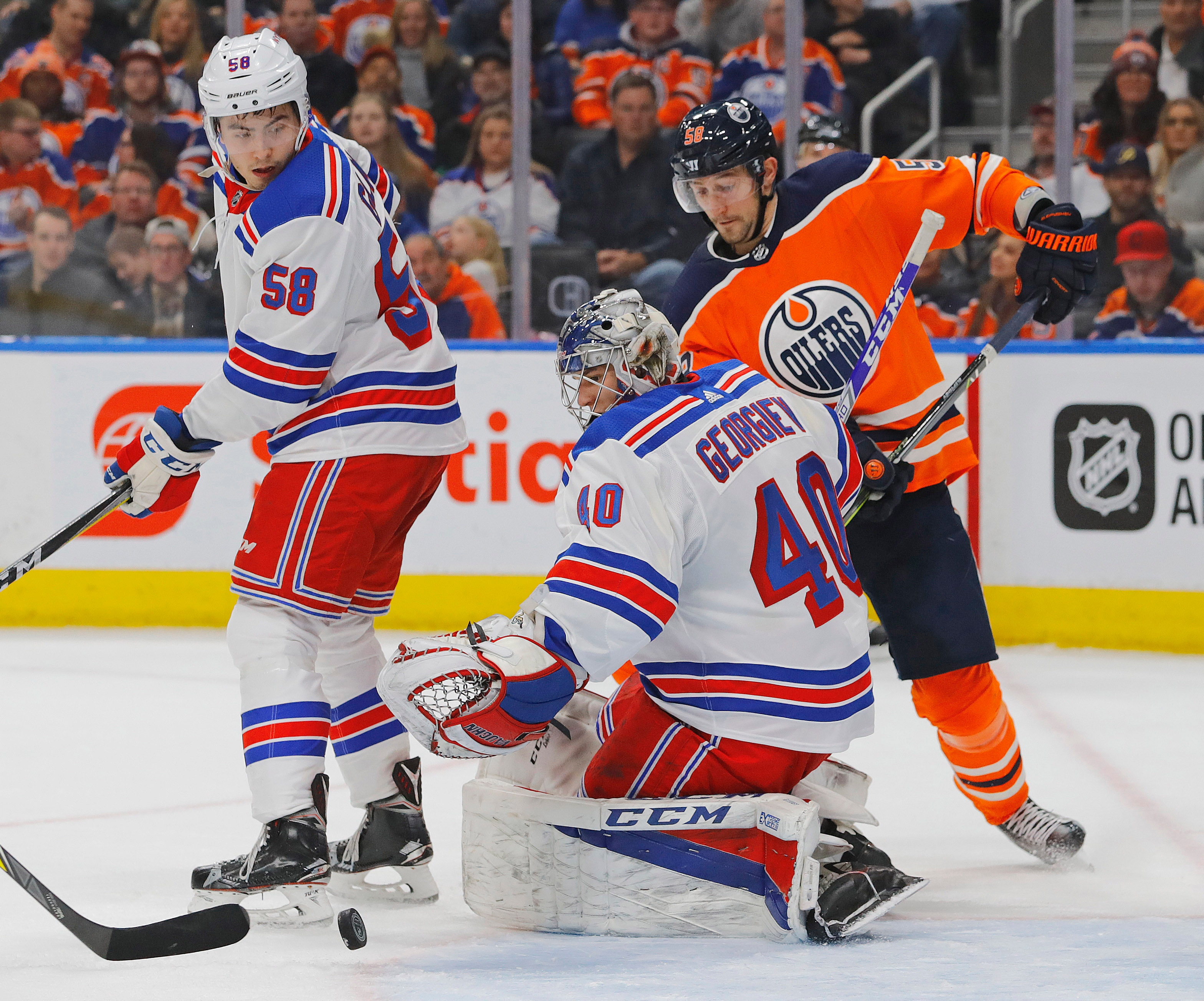 Mar 3, 2018; Edmonton, Alberta, CAN; New York Rangers goaltender Alex Georgiev (40) makes a save on Edmonton Oilers forward Anton Slepyshev (58) during the third period at Rogers Place. Mandatory Credit: Perry Nelson-USA TODAY Sports / Perry Nelson