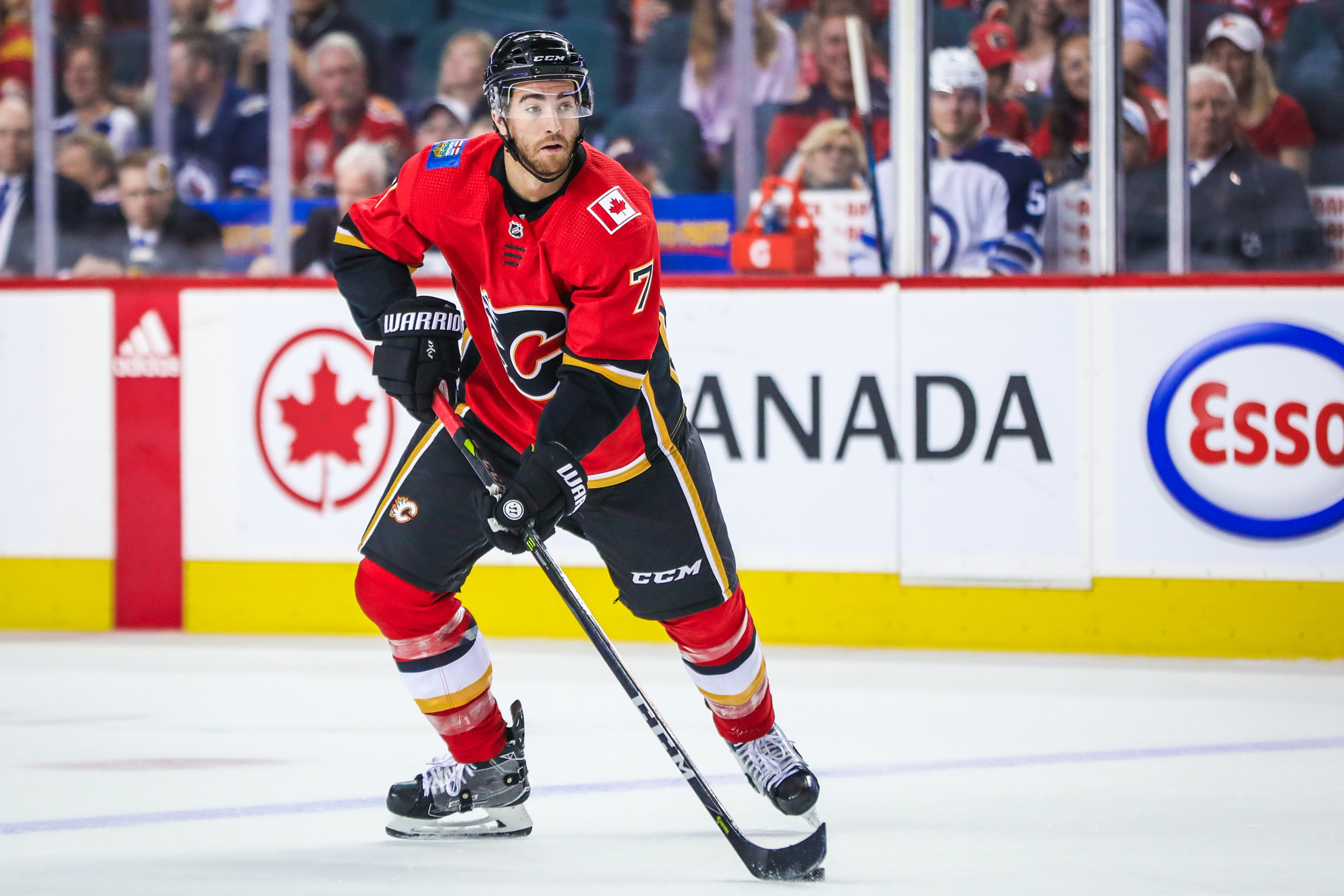 Sep 30, 2017; Calgary, Alberta, CAN; Calgary Flames defenseman T.J. Brodie (7) controls the puck against the Winnipeg Jets during the first period at Scotiabank Saddledome. Mandatory Credit: Sergei Belski-USA TODAY Sports / Sergei Belski