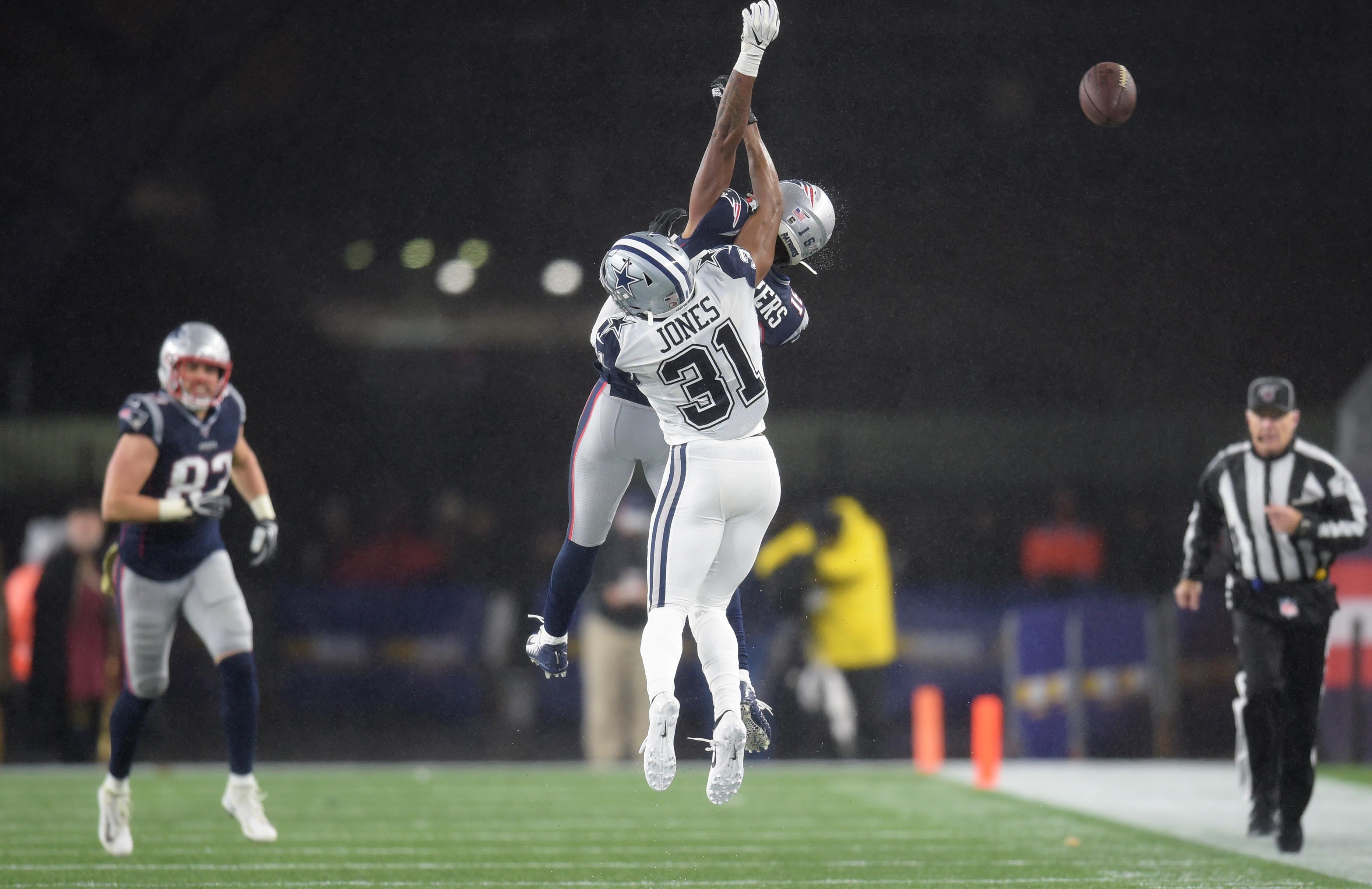 Nov 24, 2019; Foxborough, MA, USA; New England Patriots wide receiver Jakobi Meyers (16) and Dallas Cowboys cornerback Byron Jones (31) jump for the ball during the second half at Gillette Stadium. Mandatory Credit: Bob DeChiara-USA TODAY Sports / Bob DeChiara
