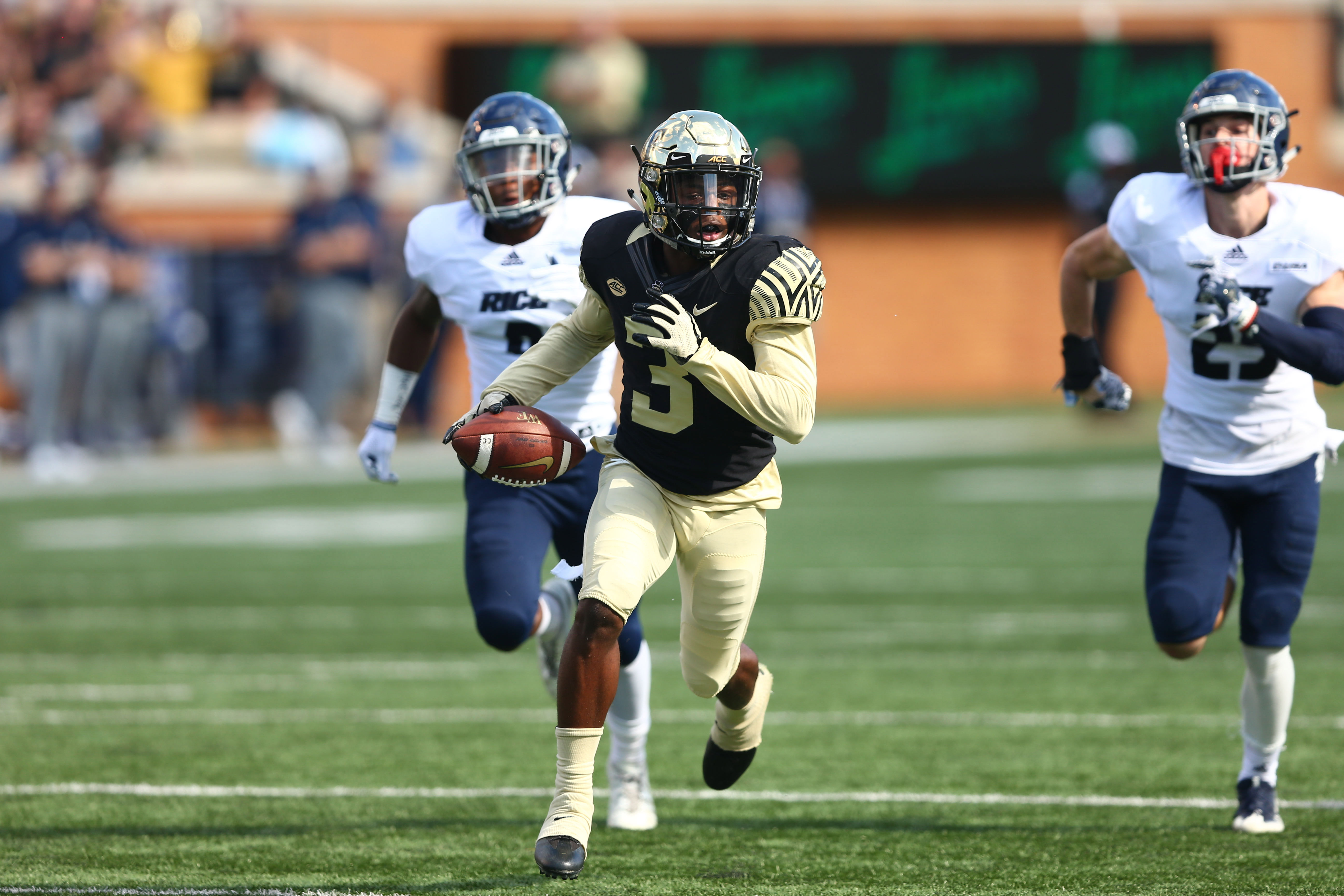Sep 29, 2018; Winston-Salem, NC, USA; Wake Forest Demon Deacons wide receiver Greg Dortch (3) runs in for a touchdown in the first quarter against the Rice Owls at BB&T Field. Mandatory Credit: Jeremy Brevard-USA TODAY Sports / Jeremy Brevard