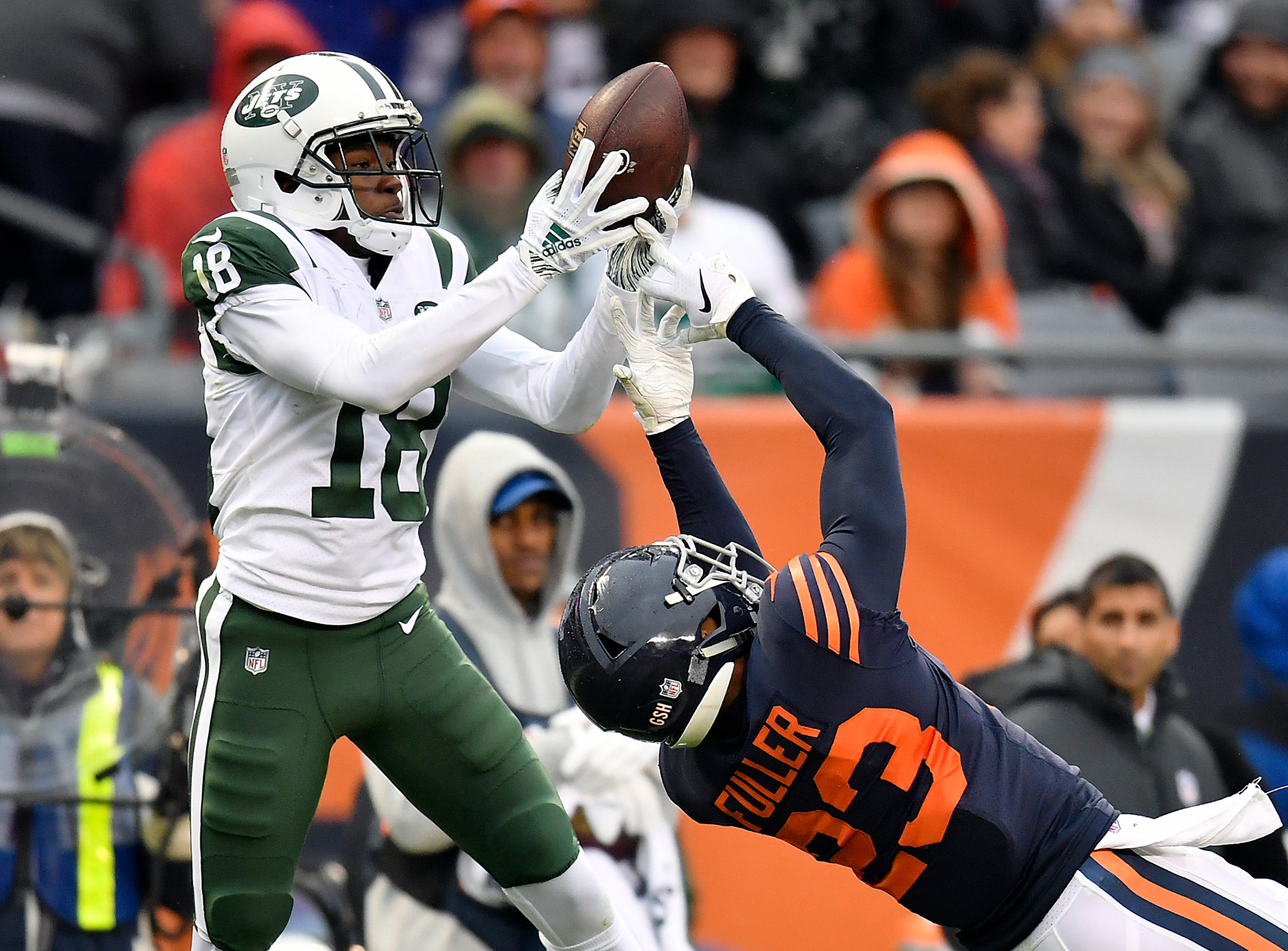 New York Jets wide receiver Deontay Burnett catches the ball against Chicago Bears cornerback Kyle Fuller at Soldier Field. / Quinn Harris/USA TODAY Sports