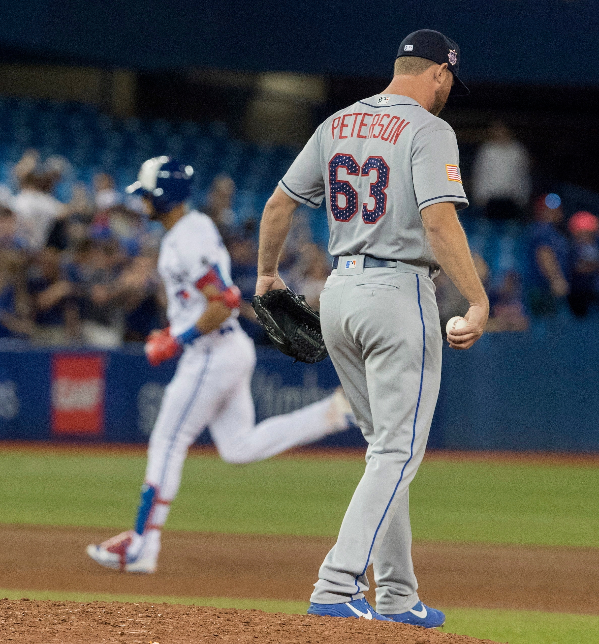 Who are Hanhold, Peterson, Gagnon and Reinheimer?All four players were added to the Mets' active roster9/4/2018, 10:22 PMNew York Mets pitcher Tim Peterson walks off the mound after giving up a two-run home run as Toronto Blue Jays' Lourdes Gurriel Jr. rounds the bases. / AP
