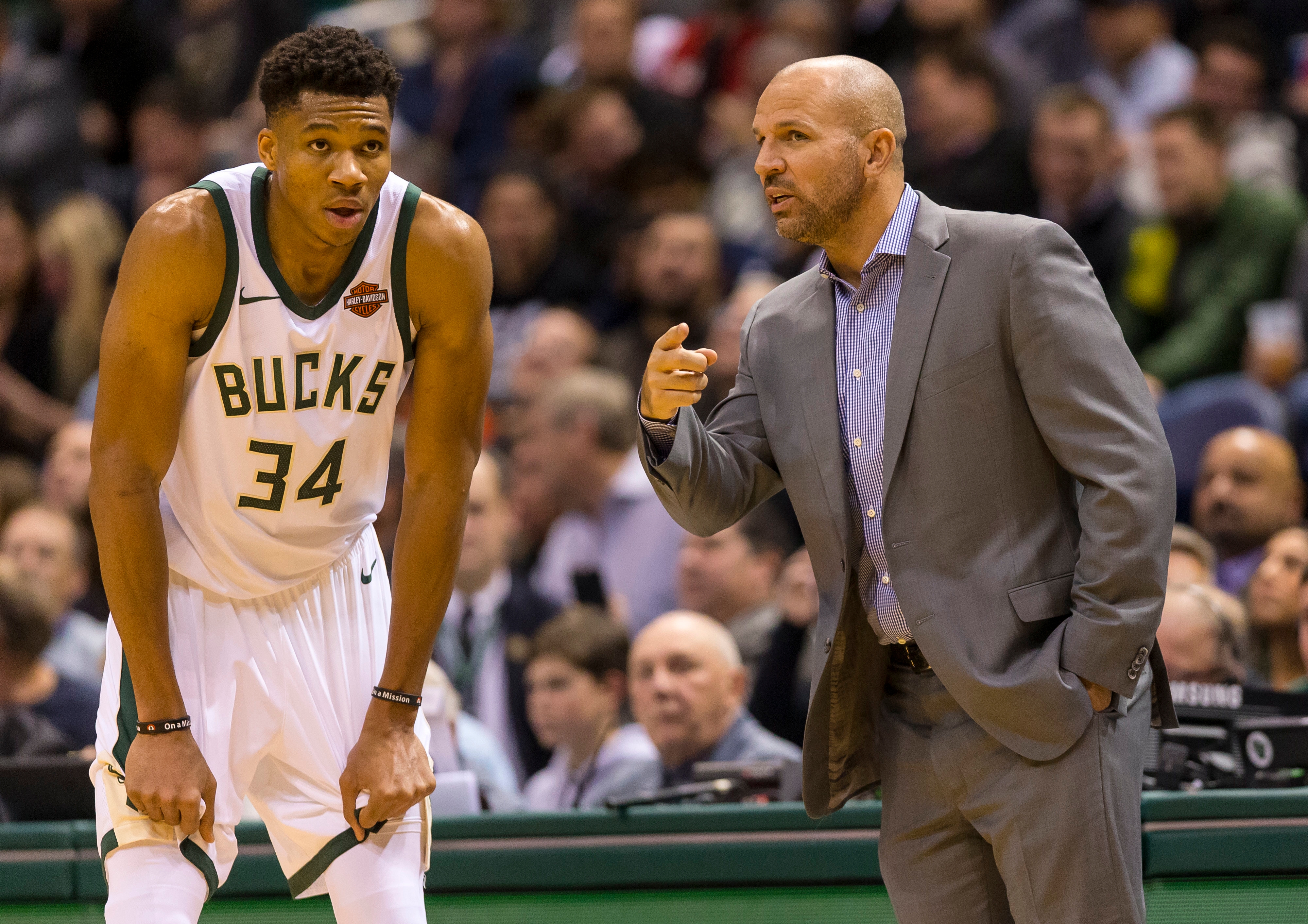 Nov 13, 2017; Milwaukee, WI, USA; Milwaukee Bucks head coach Jason Kidd talks with forward Giannis Antetokounmpo (34) during the second quarter against the Memphis Grizzlies at BMO Harris Bradley Center. Mandatory Credit: Jeff Hanisch-USA TODAY Sports / Jeff Hanisch