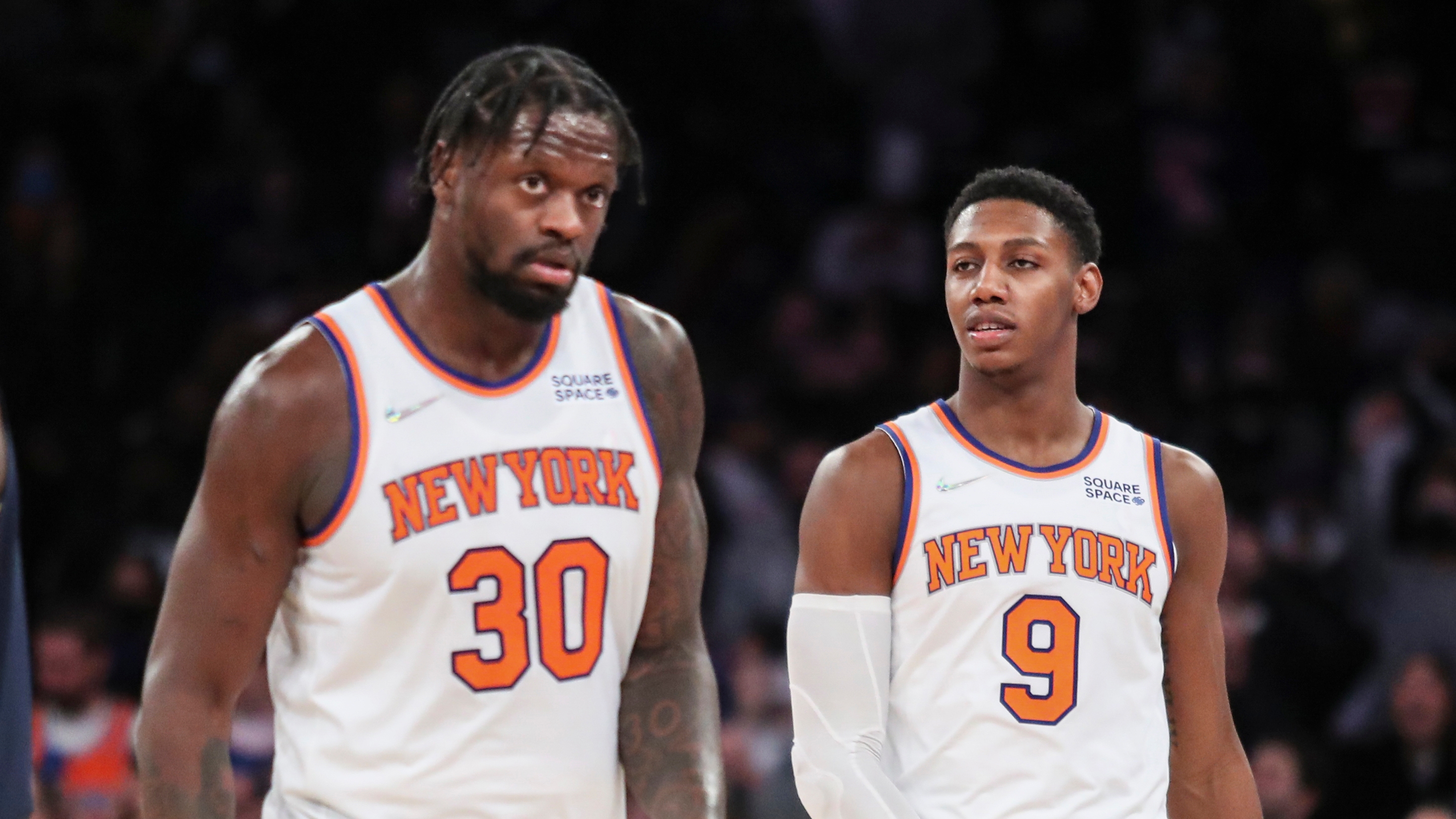Jan 4, 2022; New York, New York, USA; New York Knicks forward Julius Randle (30) and guard RJ Barrett (9) walk off the court together after defeating the Indiana Pacers 104-94 at Madison Square Garden. / Wendell Cruz-USA TODAY Sports