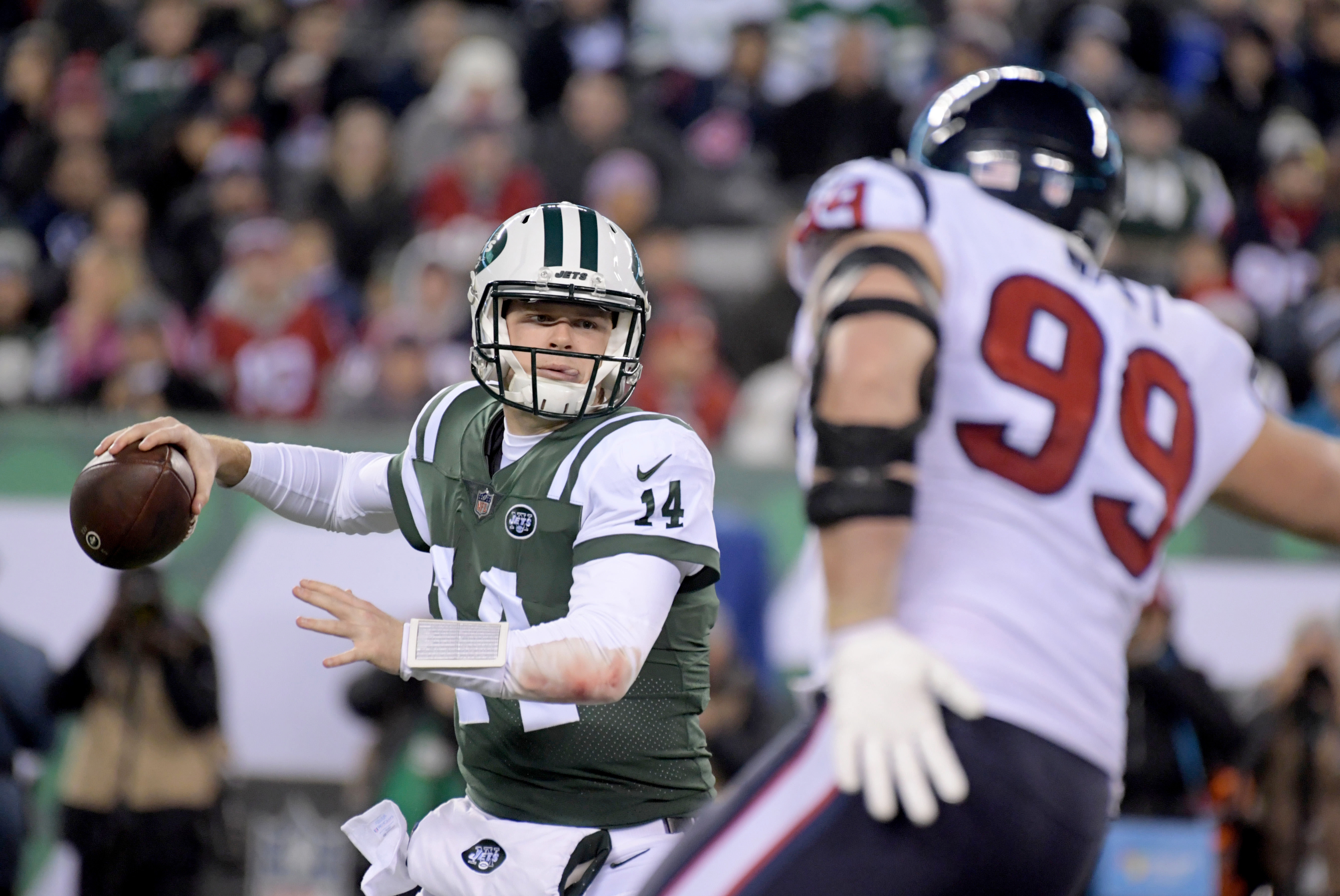 New York Jets quarterback Sam Darnold is pressured by Houston Texans defensive end J.J. Watt during the first half at MetLife Stadium. / Kirby Lee/USA TODAY Sports