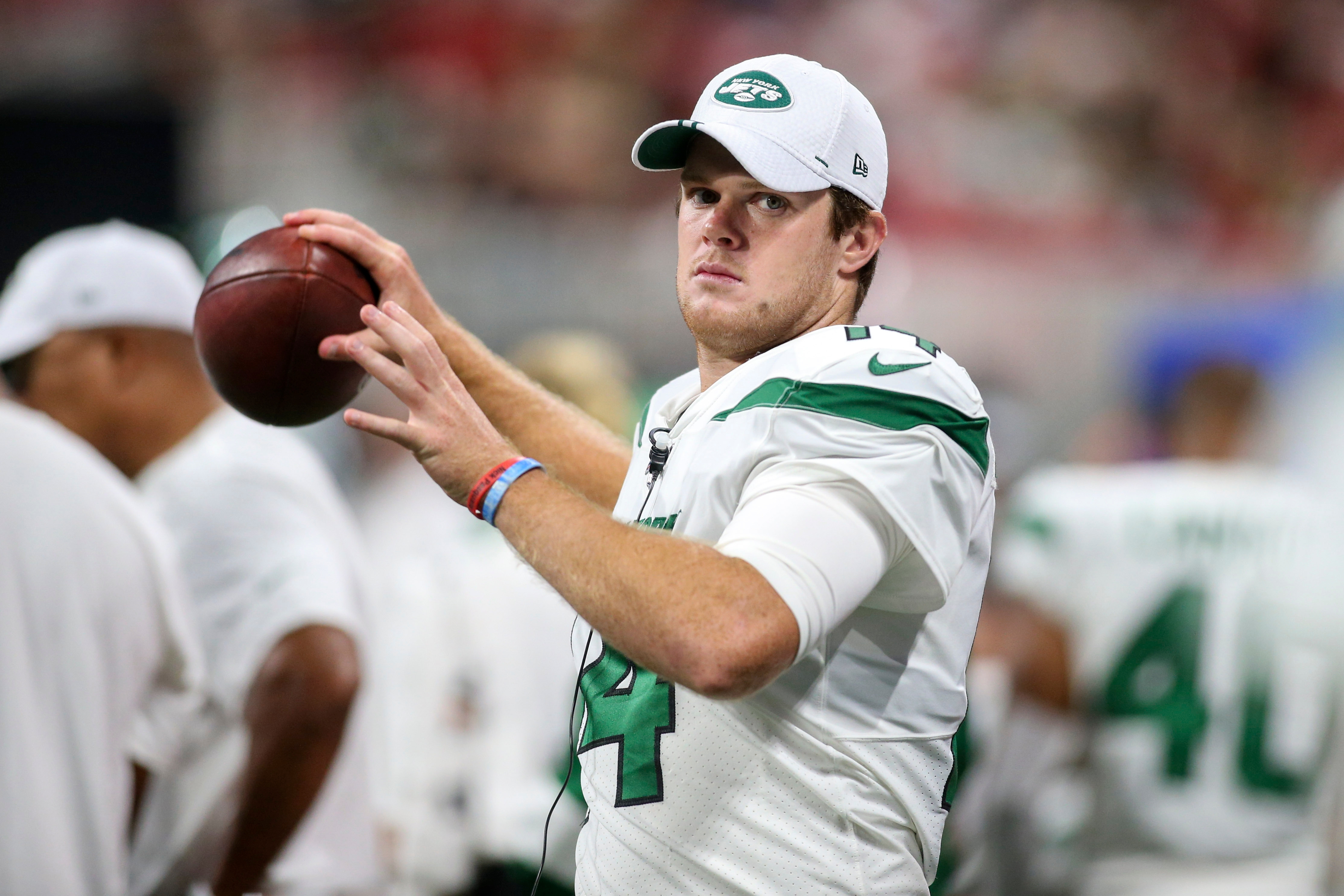 Aug 15, 2019; Atlanta, GA, USA; New York Jets quarterback Sam Darnold (14) throws on the sideline against the Atlanta Falcons in the second half at Mercedes-Benz Stadium. Mandatory Credit: Brett Davis-USA TODAY Sports / Brett Davis