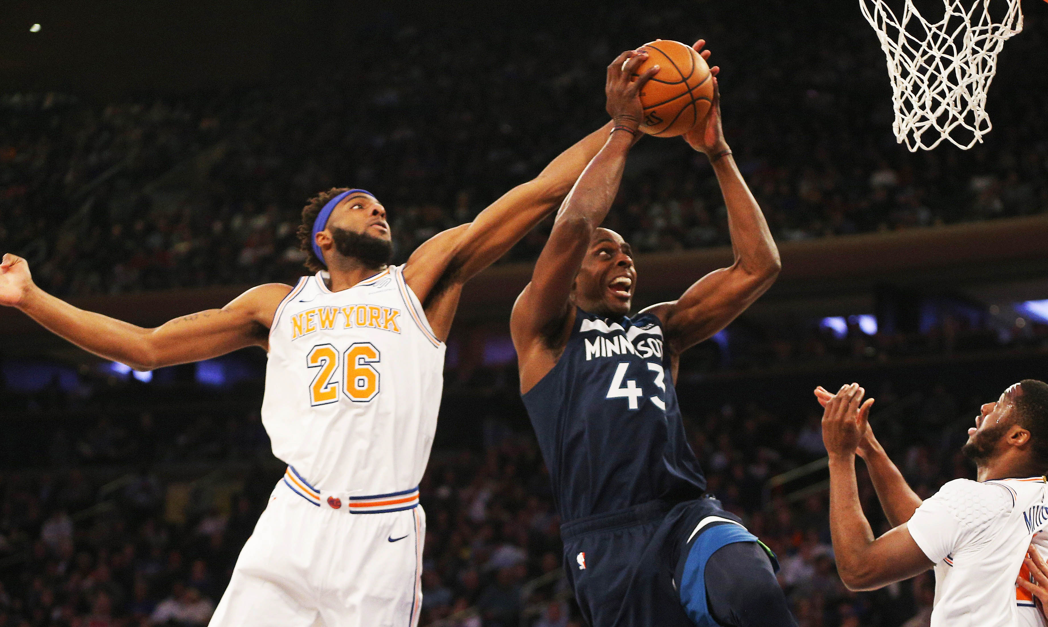 Feb 22, 2019; New York, NY, USA; Minnesota Timberwolves forward Anthony Tolliver (43) has his shot blocked by New York Knicks center Mitchell Robinson (26) during the first half at Madison Square Garden. Mandatory Credit: Andy Marlin-USA TODAY Sports / Andy Marlin