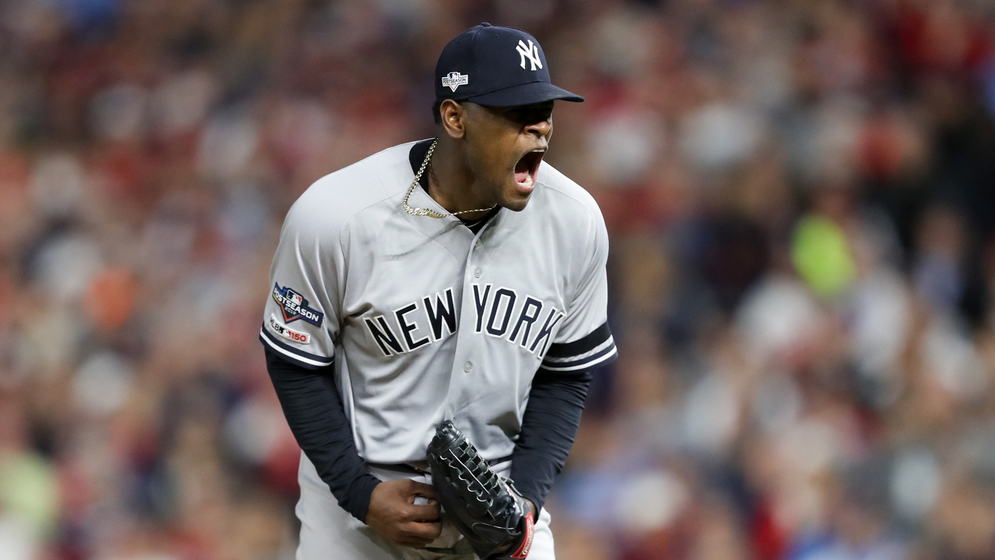 Oct 7, 2019; Minneapolis, MN, USA; New York Yankees starting pitcher Luis Severino (40) reacts during the second inning of game three of the 2019 ALDS playoff baseball series against the Minnesota Twins at Target Field. Mandatory Credit: Jesse Johnson-USA TODAY Sports / Jesse Johnson-USA TODAY Sports