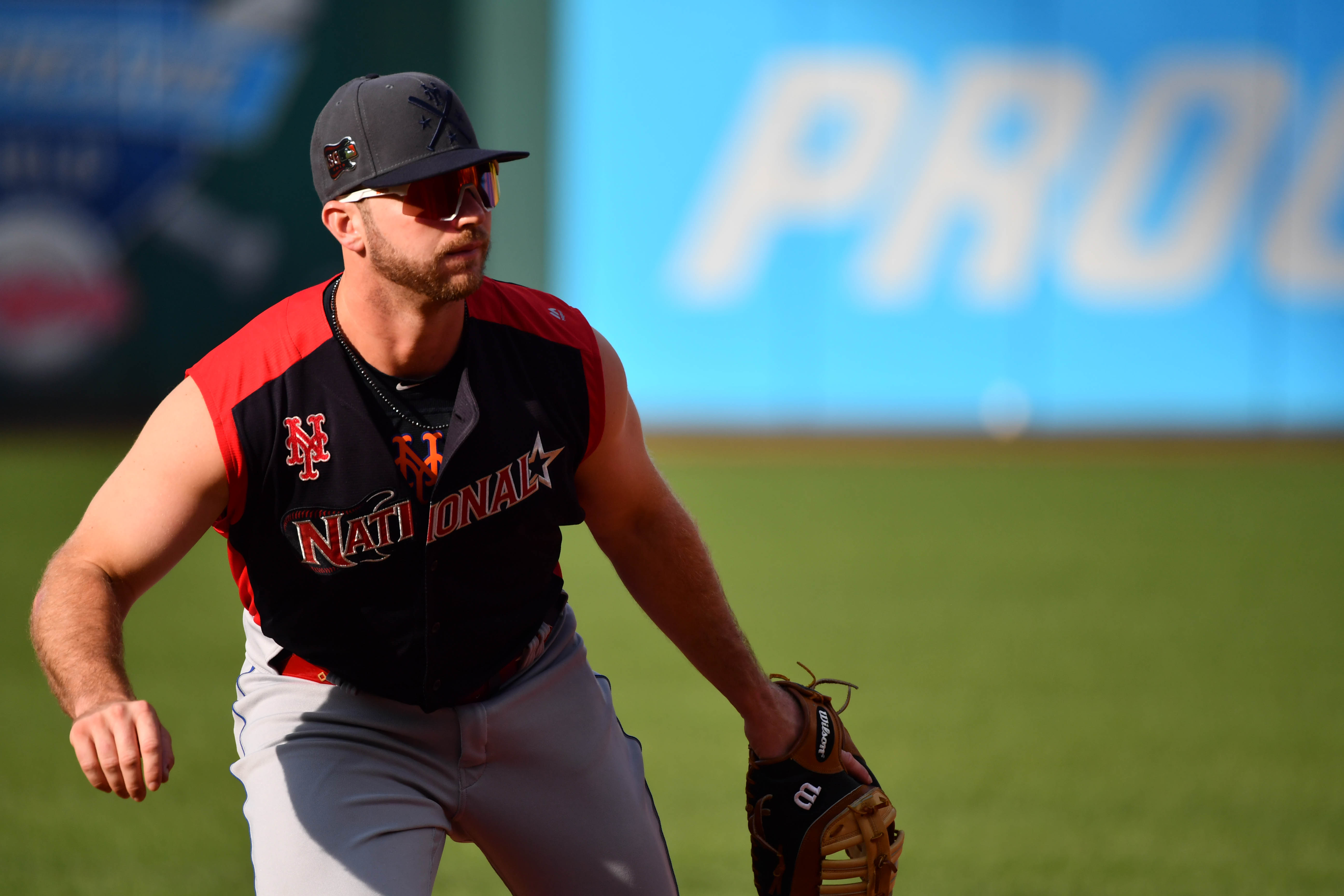 Jul 9, 2019; Cleveland, OH, USA; National League infielder Pete Alonso (20) of the New York Mets prior to the 2019 MLB All Star Game at Progressive Field. Mandatory Credit: Ken Blaze-USA TODAY Sports / Ken Blaze